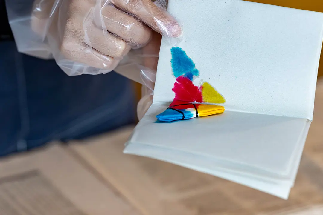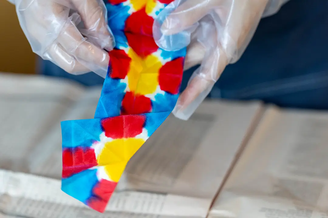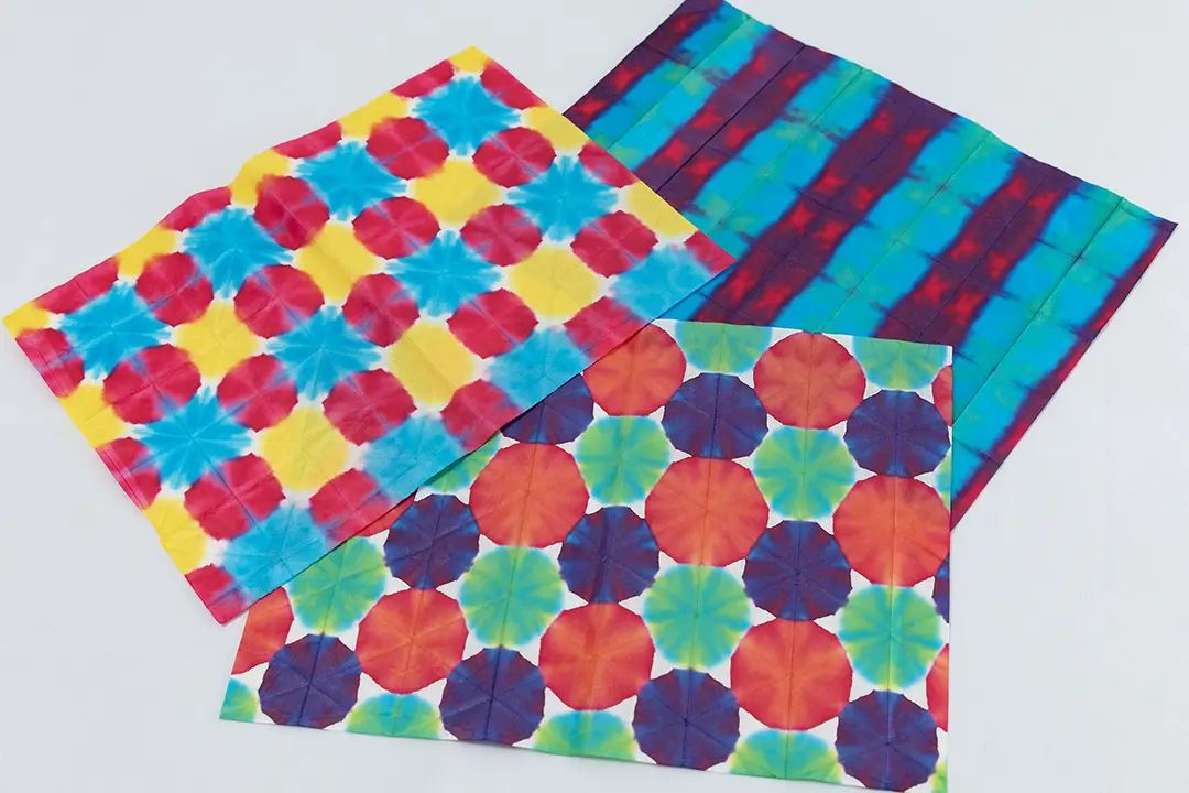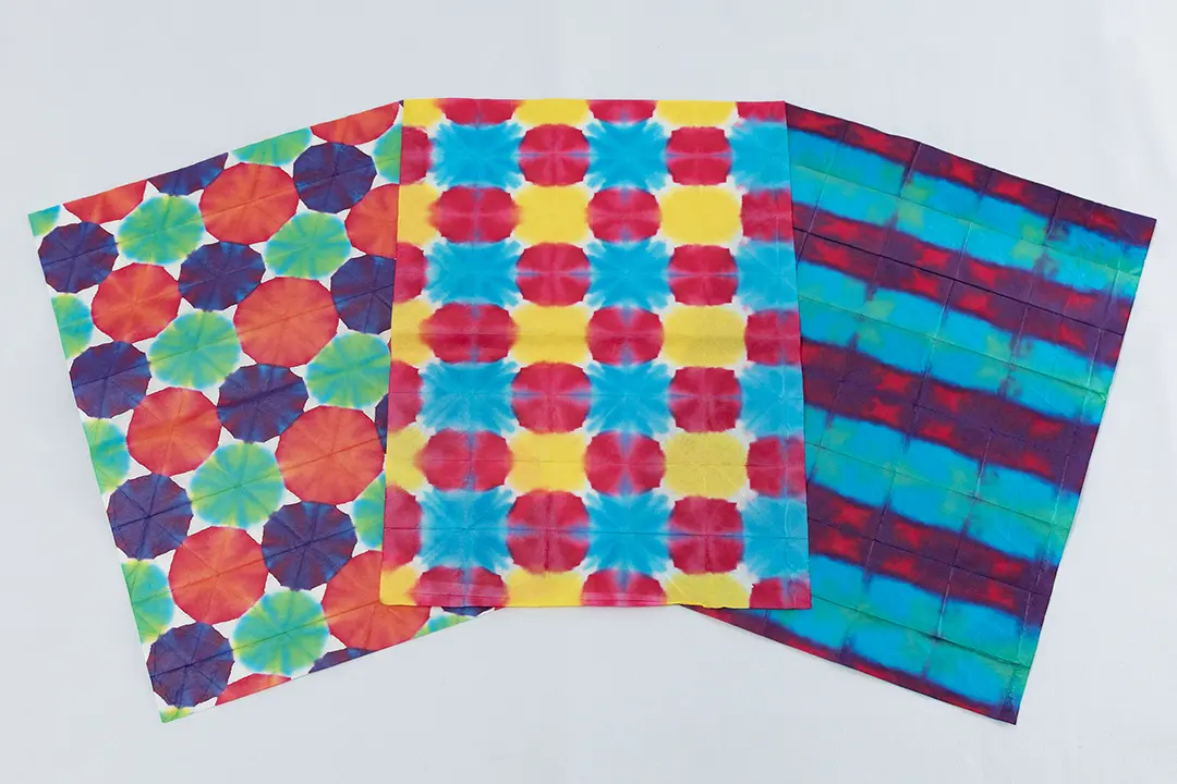 ・和紙の折り染めという少し懐かしい遊びを通して、赤・青・黄の3原色の混色の原理を学べる
