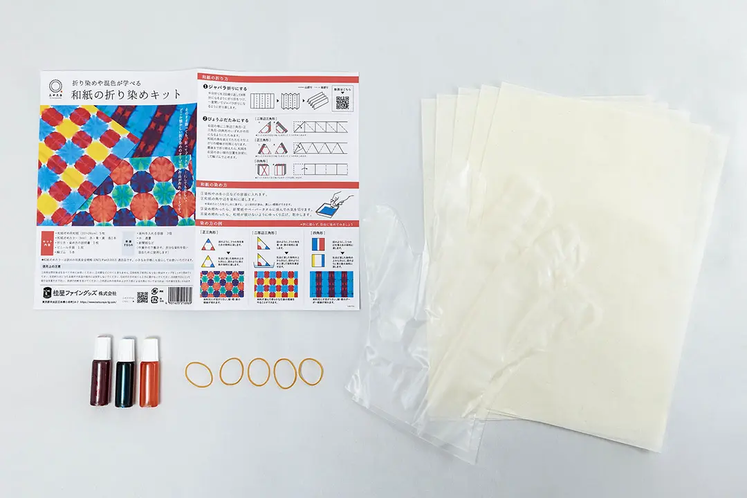 ・和紙ぞめ用和紙(33×24cm) 5枚、液体染料 3色(赤/青/黄)、輪ゴム 5本、ビニール手袋 1双、折り方・染め方の説明書 1枚
