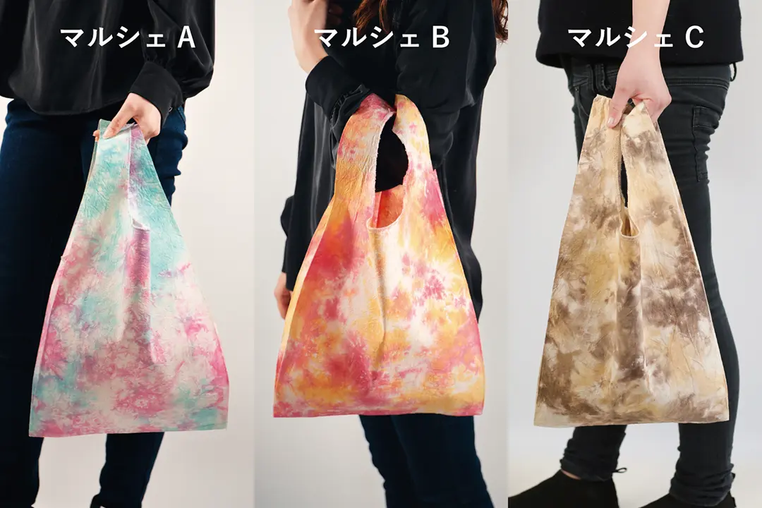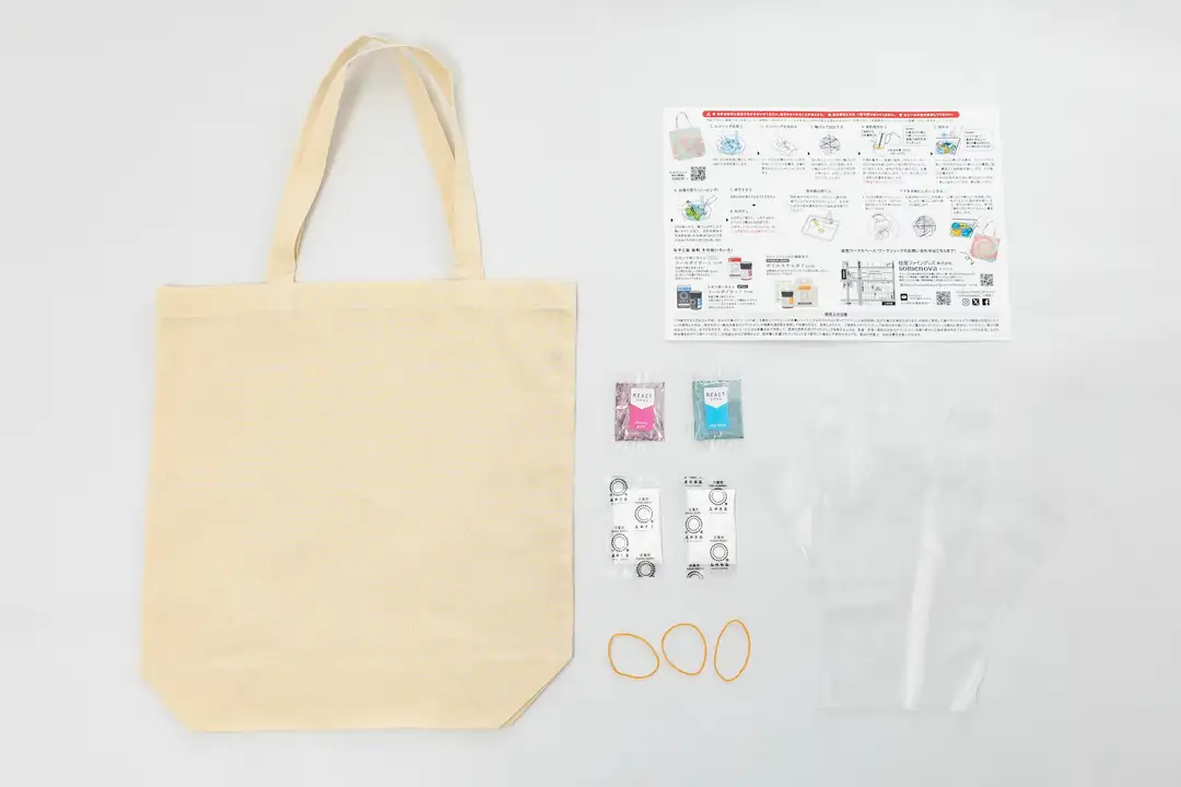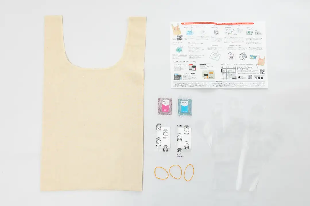エコバッグ1個、技法用染料リアクト2包(各色1包)、定着剤2包、輪ゴム3本、ビニール手袋1双/染め方説明書付