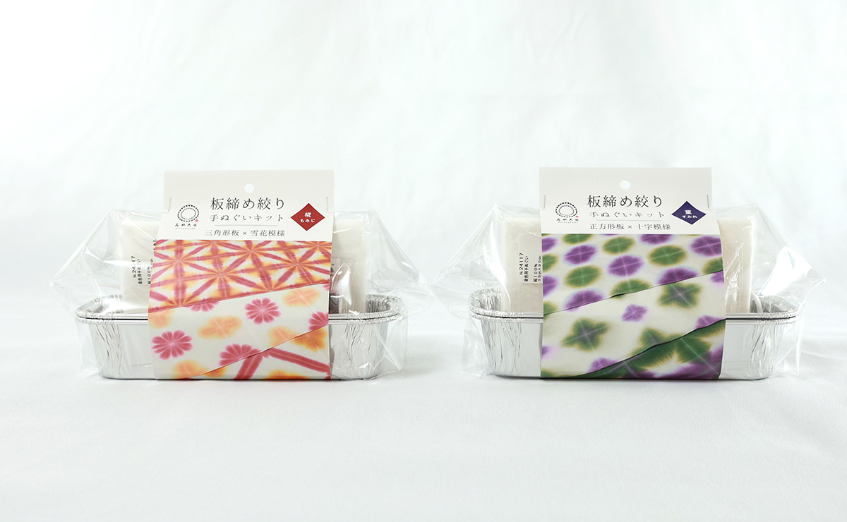 染料や板締め用板、染色容器など、板締め絞りに必要な道具が揃った染色キットです。