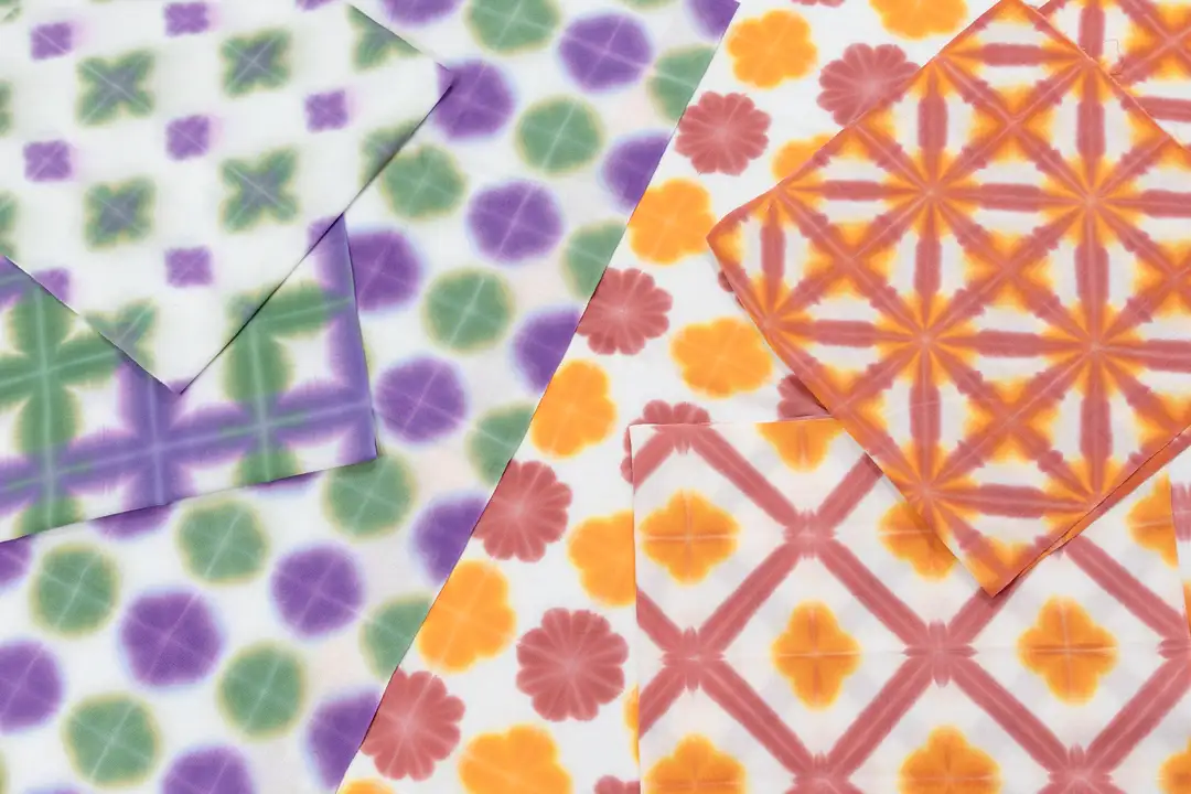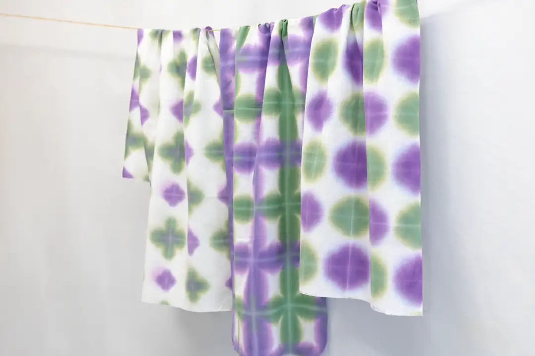・折り畳んだ布を2枚の板で挟み、2色の染料に浸すことで規則的な模様が現れる伝統的な染色技法を体験できるキット