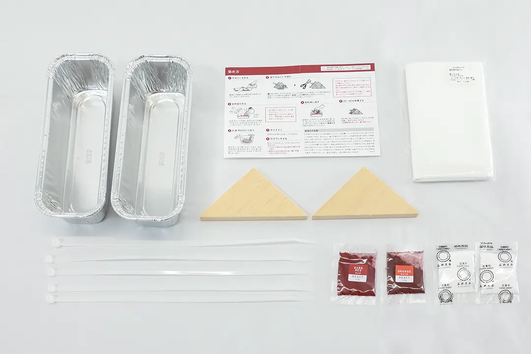 手ぬぐい(35×90cm)1枚、粉体染料2包(各色1包)、定着剤2包、染色用アルミ容器2個、板締め用板(三角形)2枚、 結束バンド5本/絞り方説明書付き