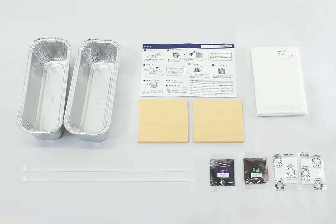 手ぬぐい(35×90cm)1枚、粉体染料2包(各色1包)、定着剤2包、染色用アルミ容器2個、板締め用板(正方形)2枚、 結束バンド2本/絞り方説明書付き