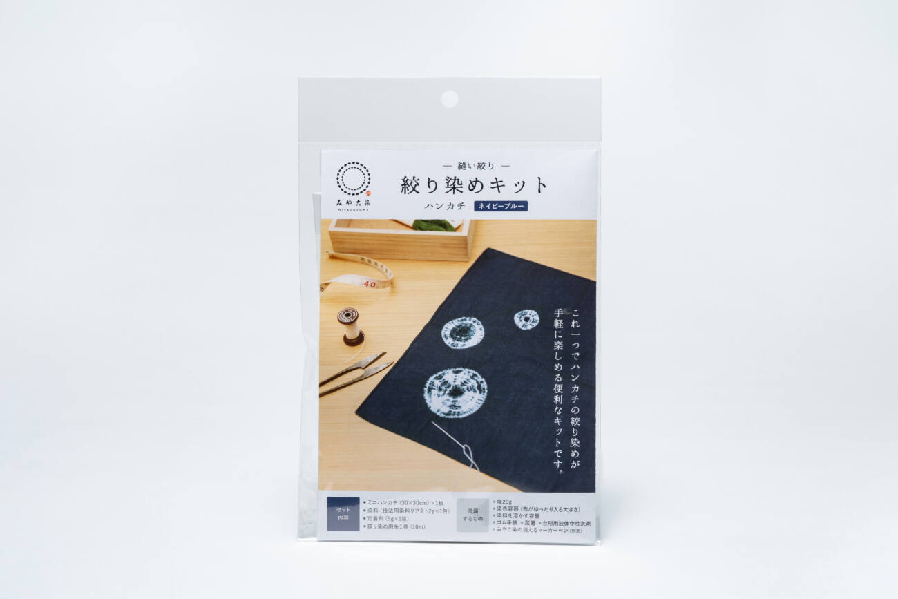 糸で縫うことで本格的な絞り染めが出来上がるハンカチと染料のキット商品です。