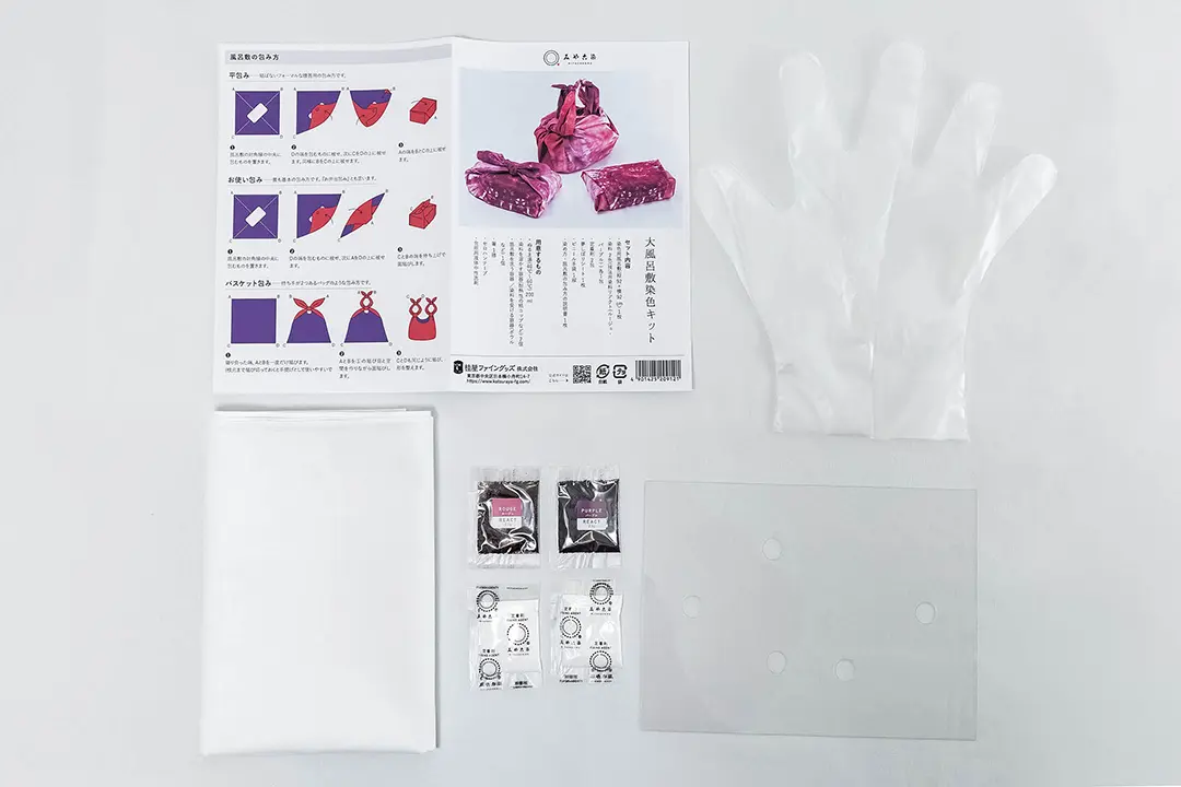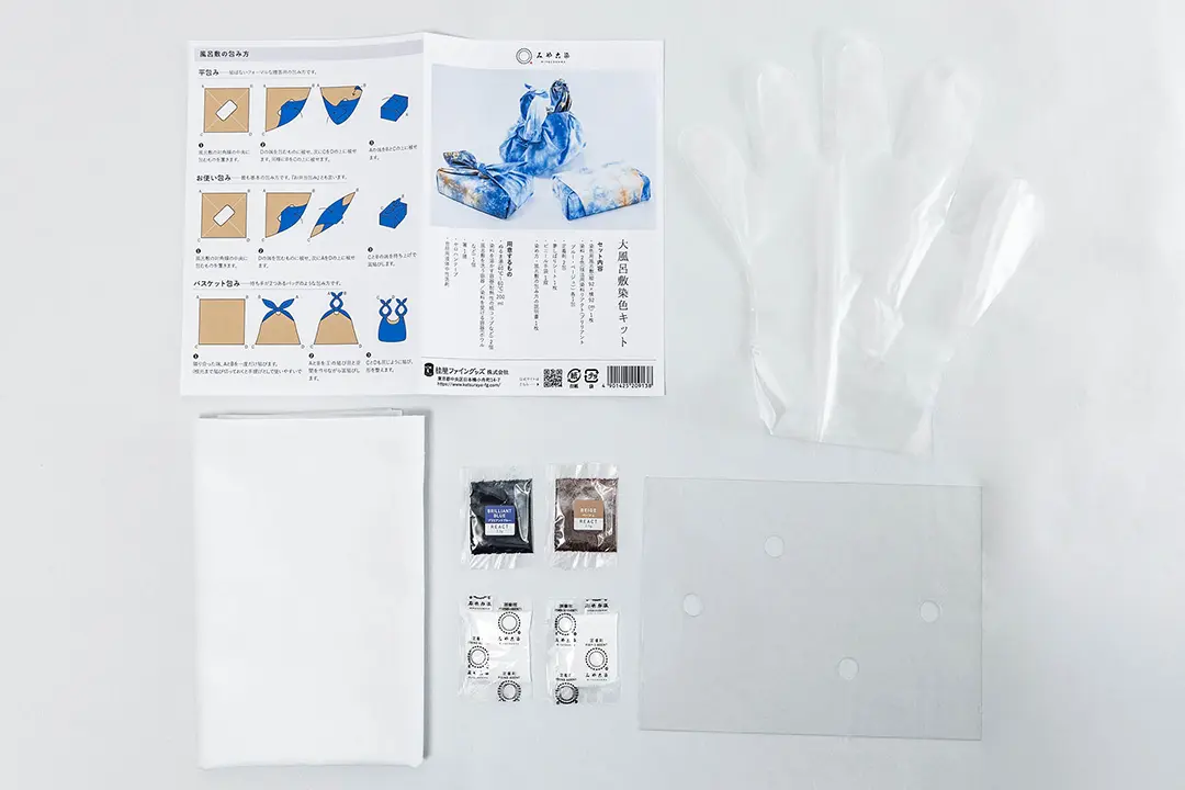 ・染色用風呂敷(92×92cm) 1枚、粉体染料2包(各色1包)、定着剤 2包、夢しぼりシート1枚、ビニール手袋1双/ 染め方・包み方の説明書付き