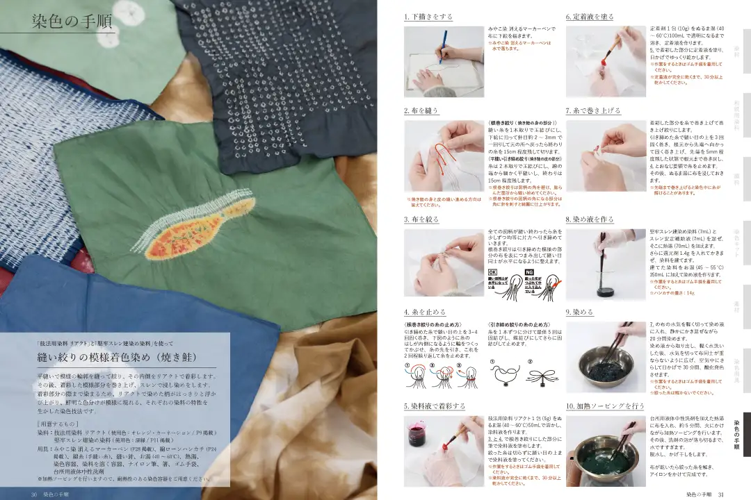 2026年度版では表紙写真に使用している技法用染料リアクトと堅牢スレン建染め染料を使用した「縫い絞りの模様着色染め」の手順を掲載しております。
