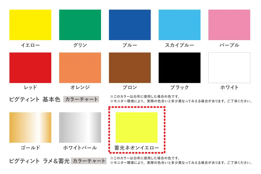 ⚠蓄光ネオンイエローは混色や水で薄めることで上記の特性が失われる場合がありますので、ご注意ください。
