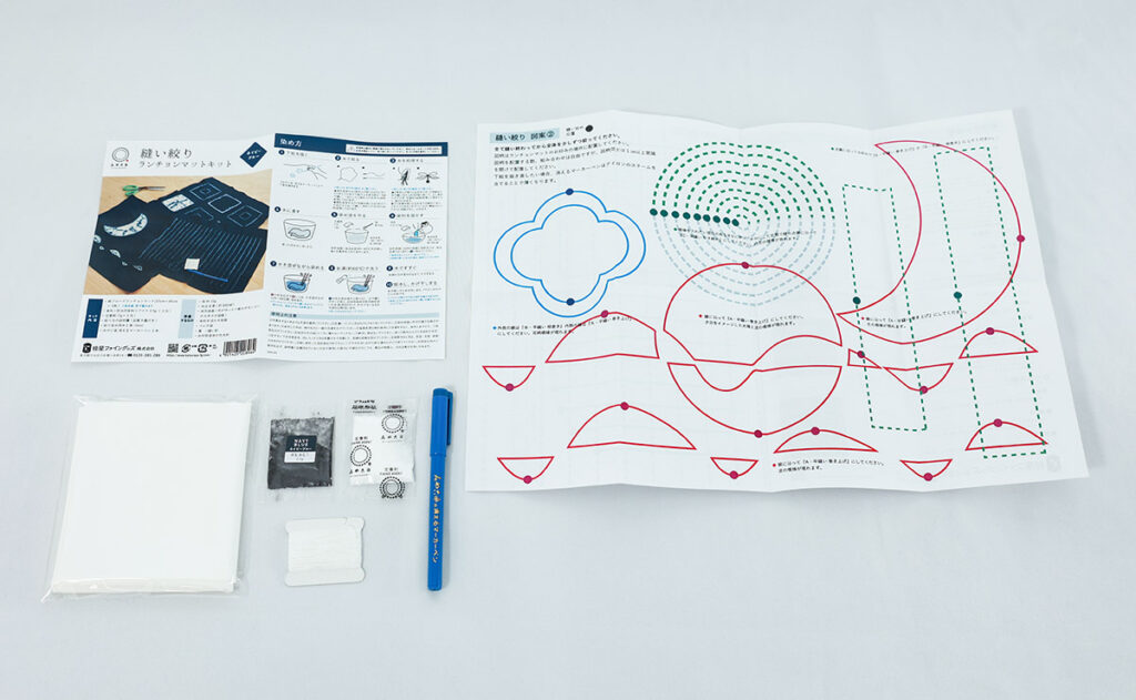 「縫い絞りランチョンマットキット」は、絞りやすい専用の糸と図案が9種付属し、文様を考案する手間がかからず、4種の絞り方、染色方法などイラストを用いた丁寧な説明書により、初めての方でもスムーズに作業を進めることができます。並縫いで面を表現したり、円状に縫って巻き上げ絞りで円を作ったり、糸を使った絞り染めの醍醐味を手軽に楽しむことが出来ます。