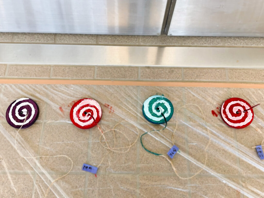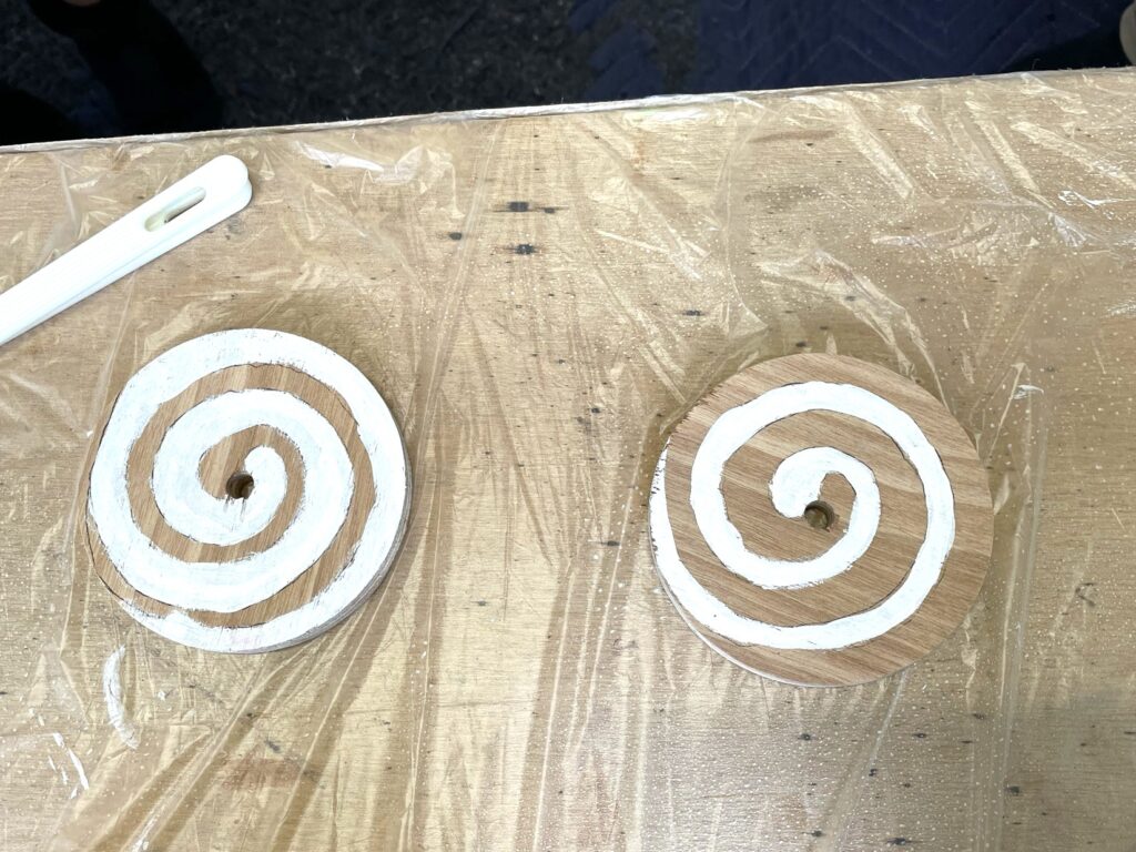 ①丸く切った木の廃材にペンキで渦巻きを描き、乾かす。