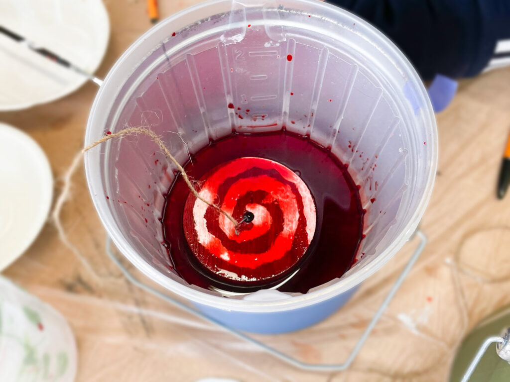 木の廃材にペンキでペイントをして、コールダイオールで染めて、コースターとして再利用しようという