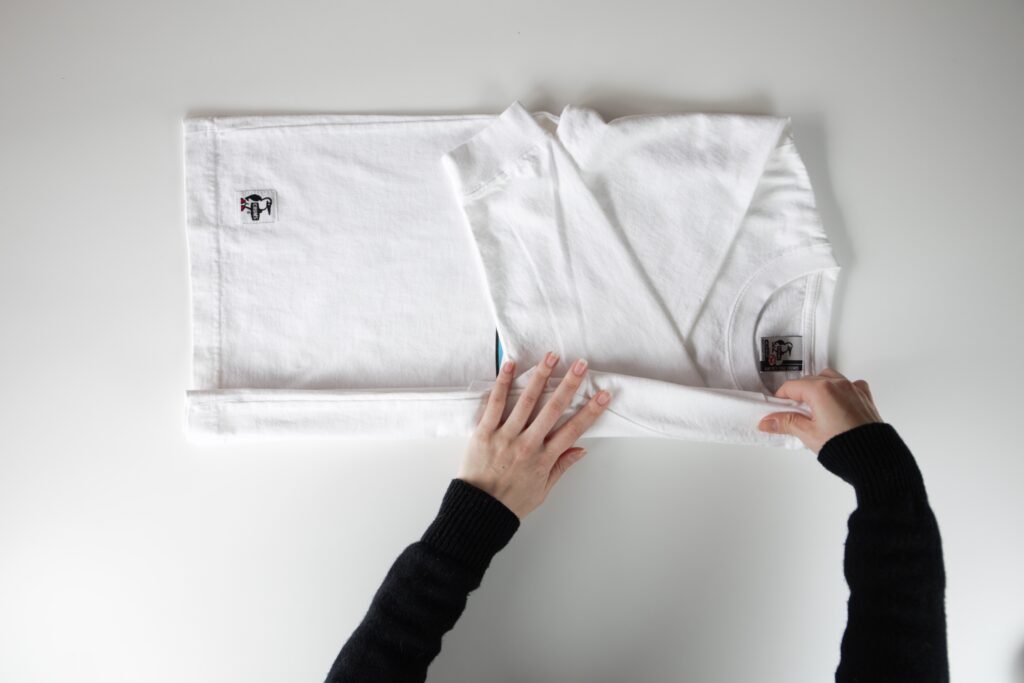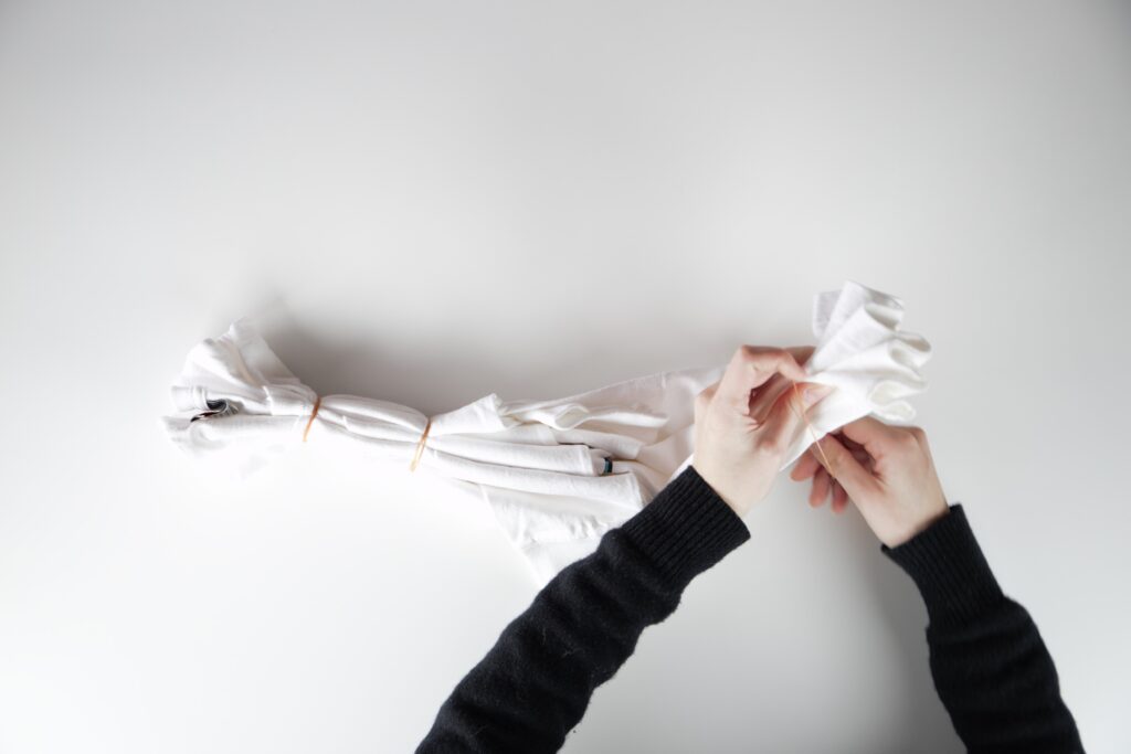 Tシャツを畳んで輪ゴムで絞り一度目の染色、