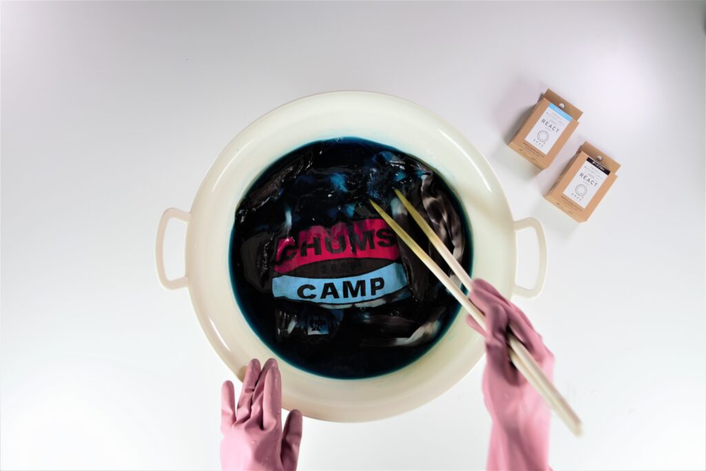 9, 染め液にシャツを入れ、やさしくかき混ぜながら20分染める