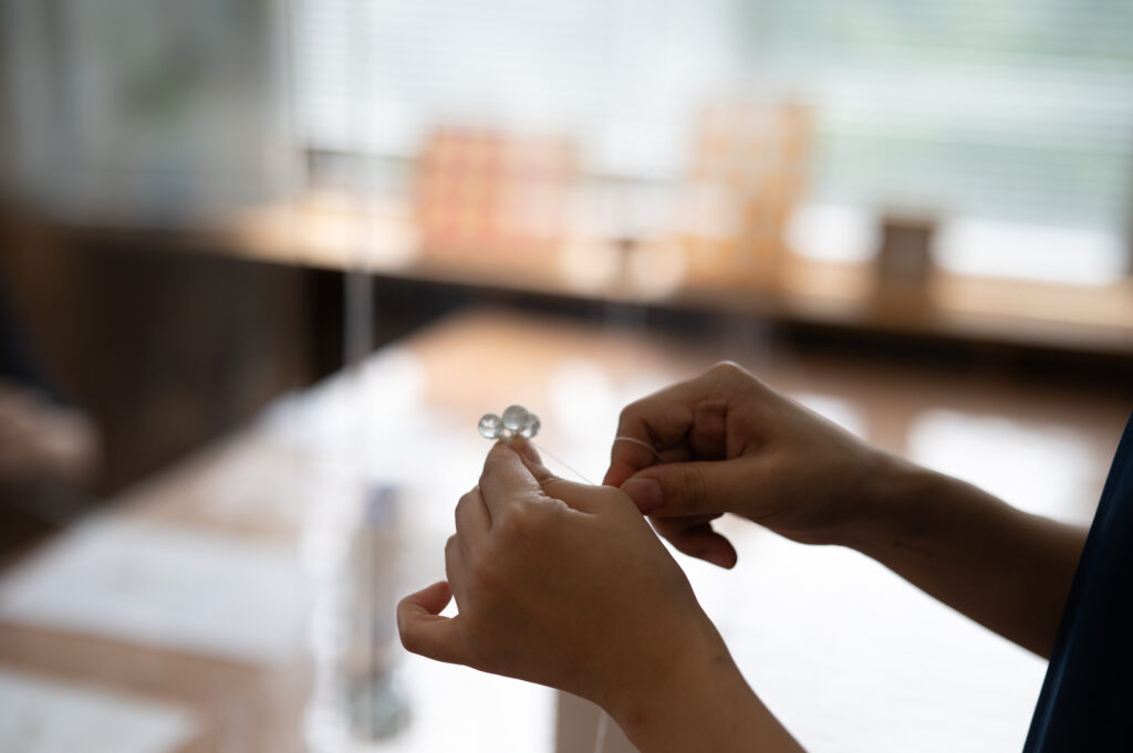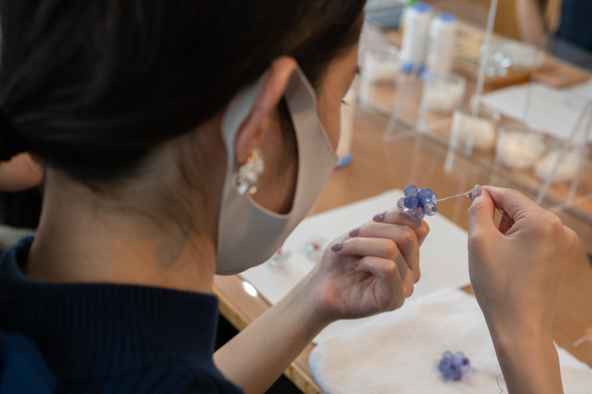 仕上げは、糸を解き、イヤリングのピンを先生が其々つけて下さって完成!