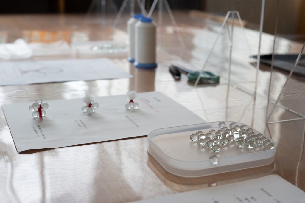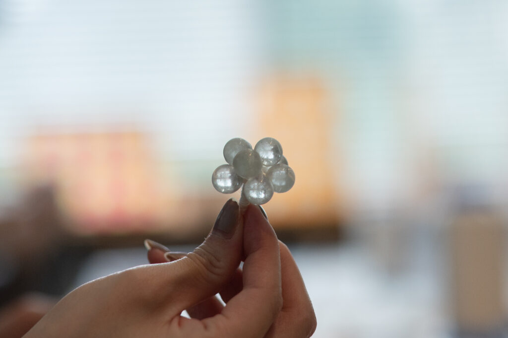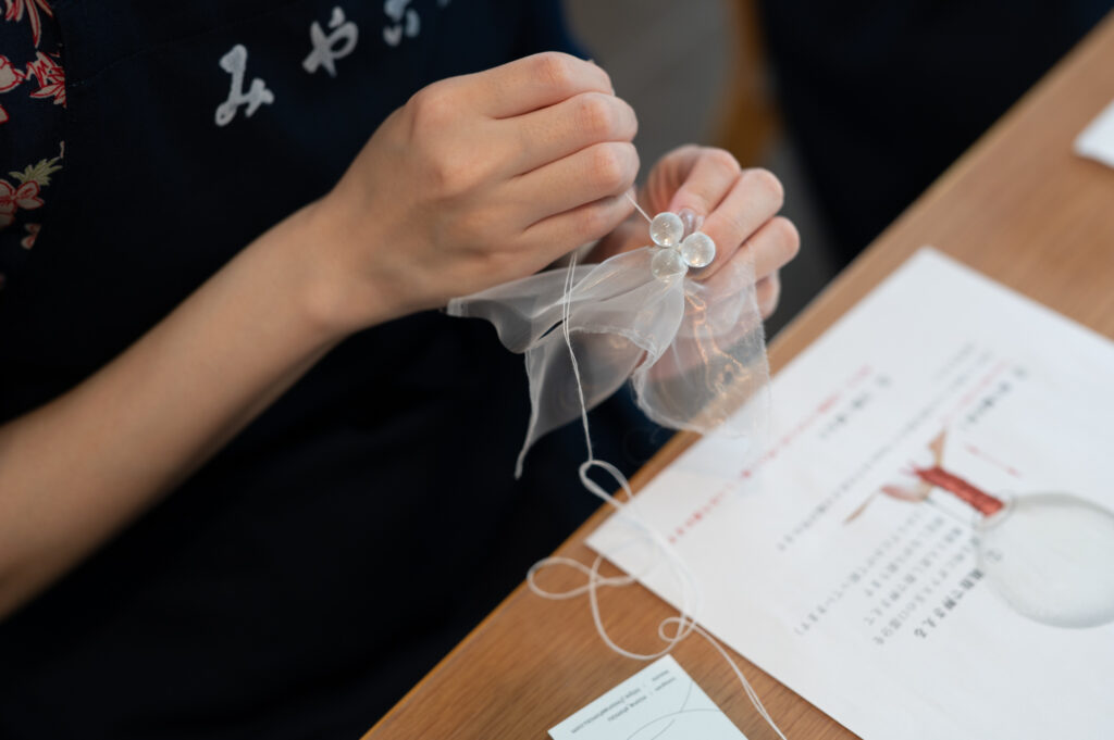 3時間のワークショップのうち、最初の2時間ばかりは、 薄いオーガンジー生地にビー玉を入れ二本の糸で括り上げ