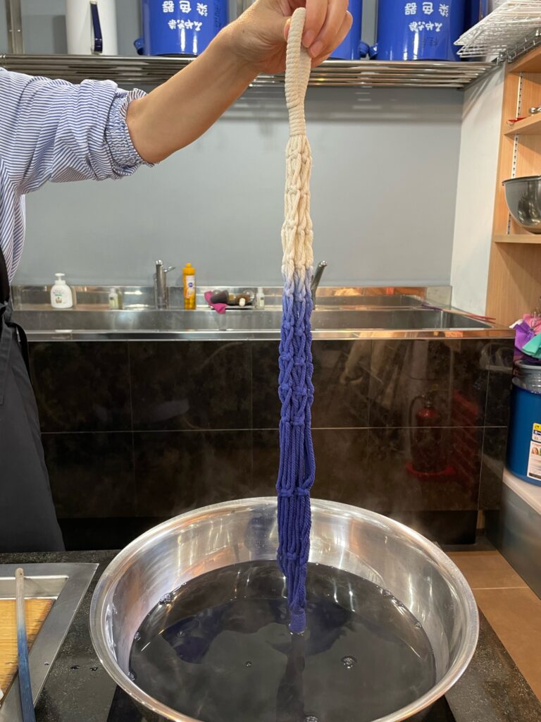 みやこ染の染料で染めたマクラメを紹介していただきました。