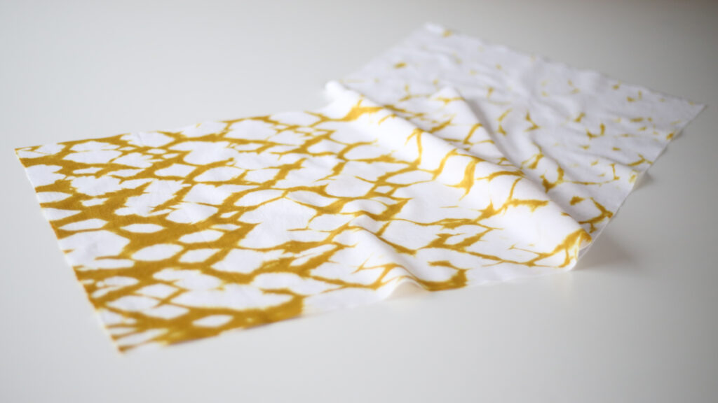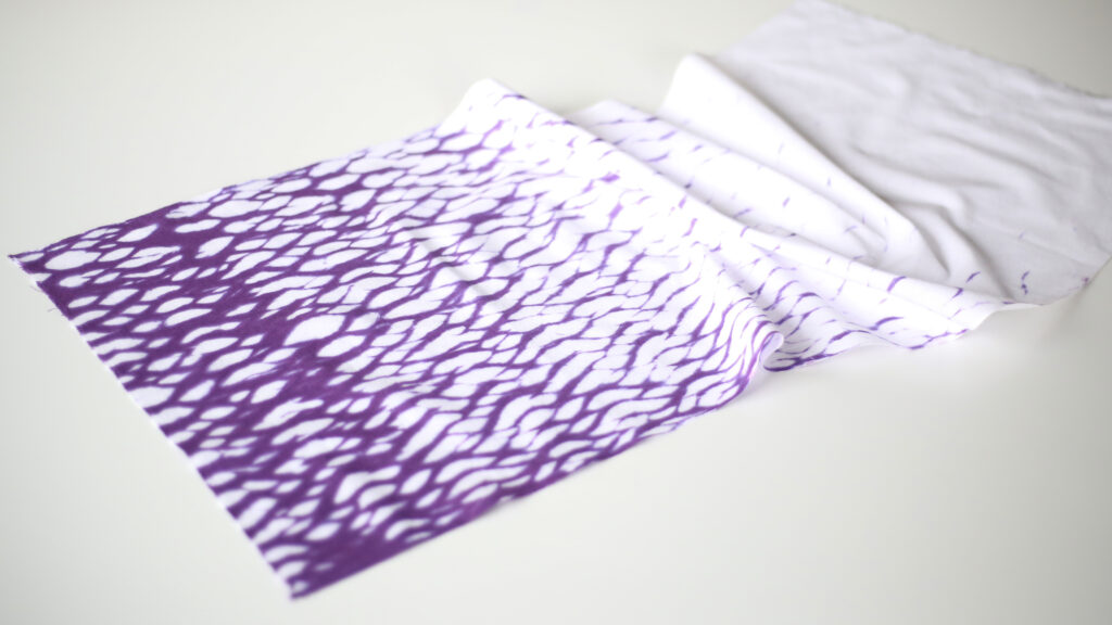 木製の丸い棒に布を巻きつけ、寄せて絞ることで、空に浮かぶ雲のような美しい模様を写し出す技法です。