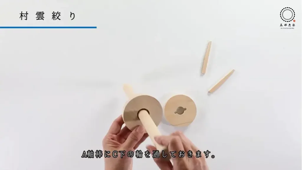 ⑤布を通したら、B上の輪を乗せて押し縮め、Dくさびで動かないように輪をしっかり固定します。