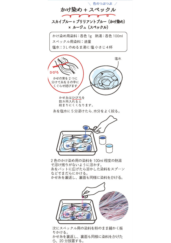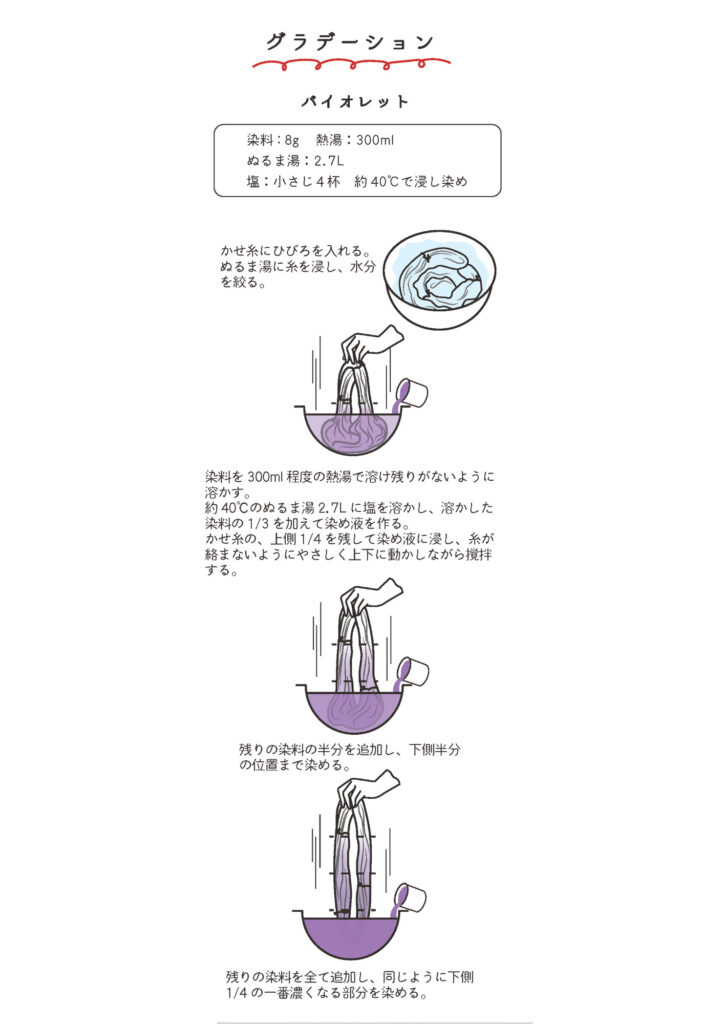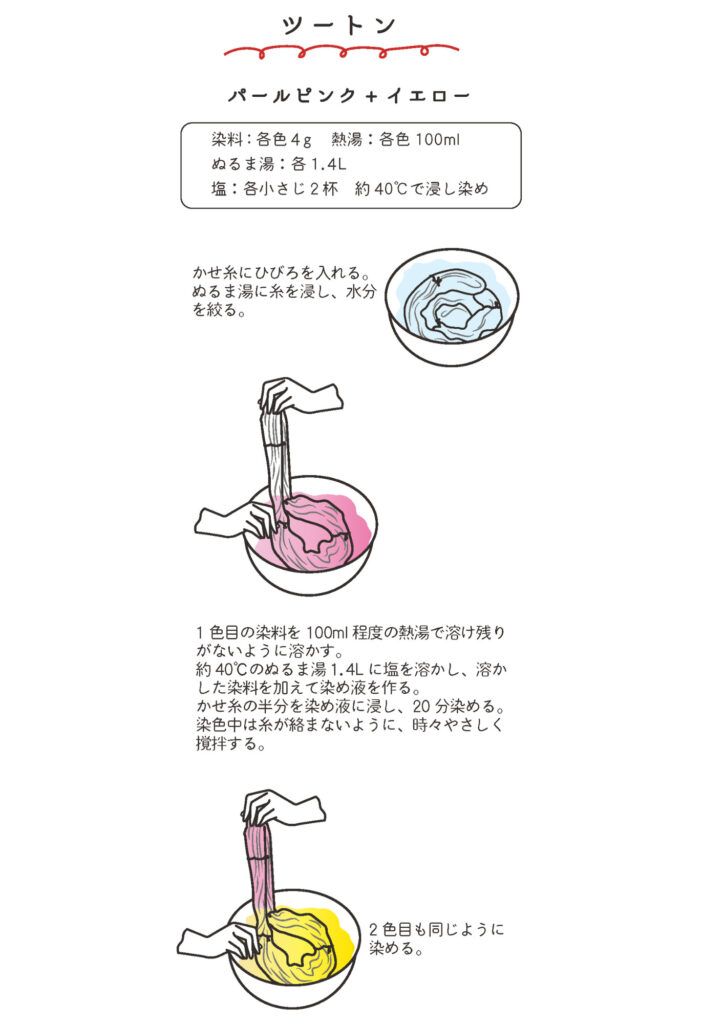 糸は絡まりやすいので注意して作業してください。その後、色止剤ミカノールで色止めを行ってください。
