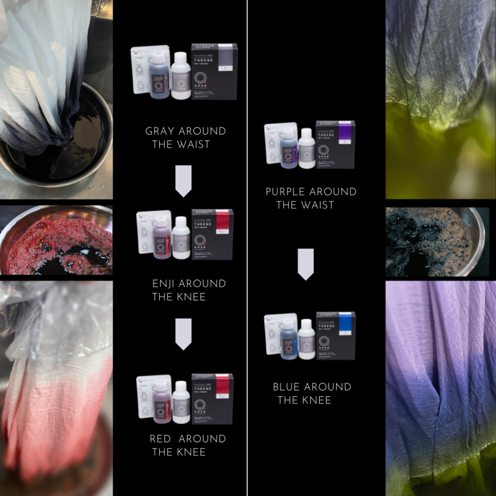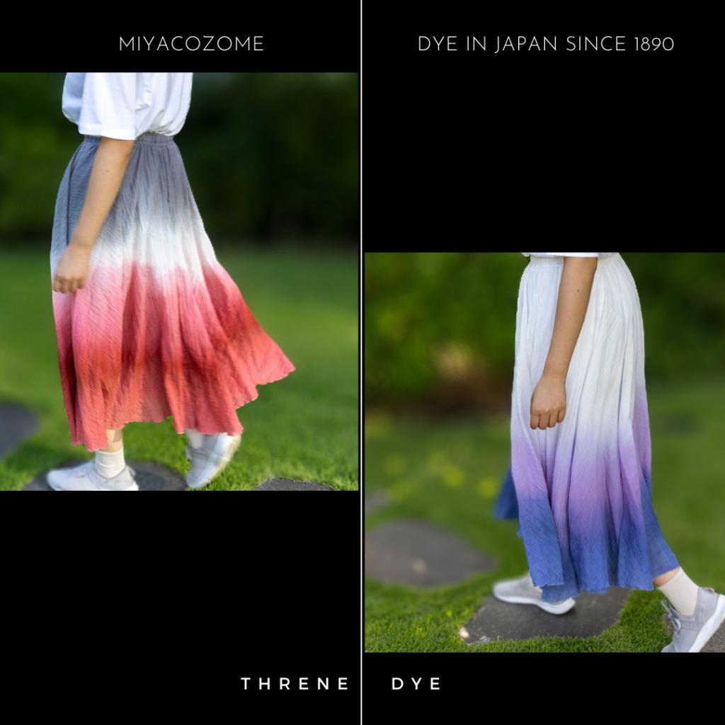 今回はグラデーション染めに挑戦! ふっくらしたフレアのスカートに、スレンの持ち味である落ち着いた色合いが良い感じに染まりました!