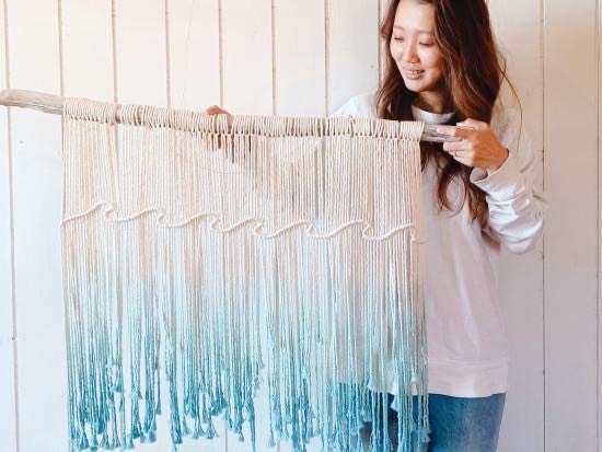 □「青い空と海を連想させるブルーやサンセットを連想させるオレンジのグラデーションで、大好きな海をマクラメで表現したいと思い、染料を探しはじめました。コールダイオールが有害指定化学物質を含まない人と環境に優しいECO染料という特徴に惹かれ、すぐに購入を決めました。