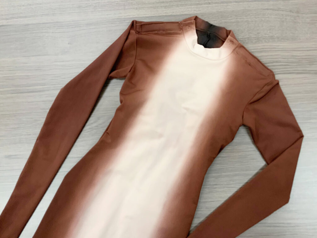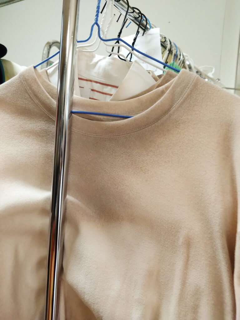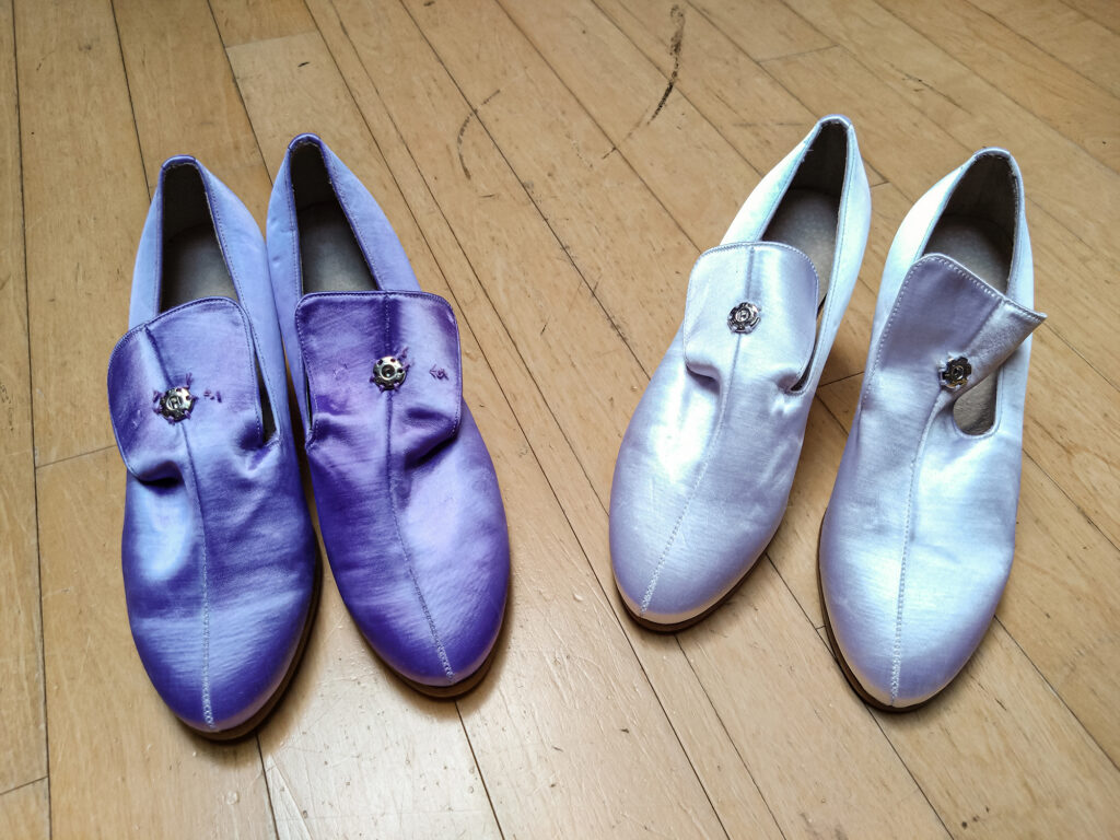 施設内を案内していただくと、そこかしこに衣裳がならんでおり、その、いたるところにみやこ染が使われているとのこと。一例として、衣裳に使う生地のグラデーション染めやムラ染め、シューズの染め変え、装飾パーツの染色、さらには公演中の衣裳のリペア(染め直し)など、様々な用途で使っていただいていることを、実物を拝見しながら教えていただきました。
