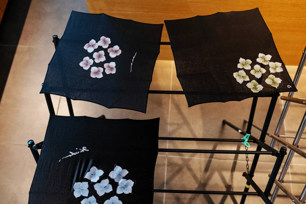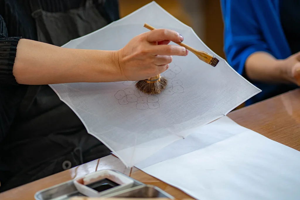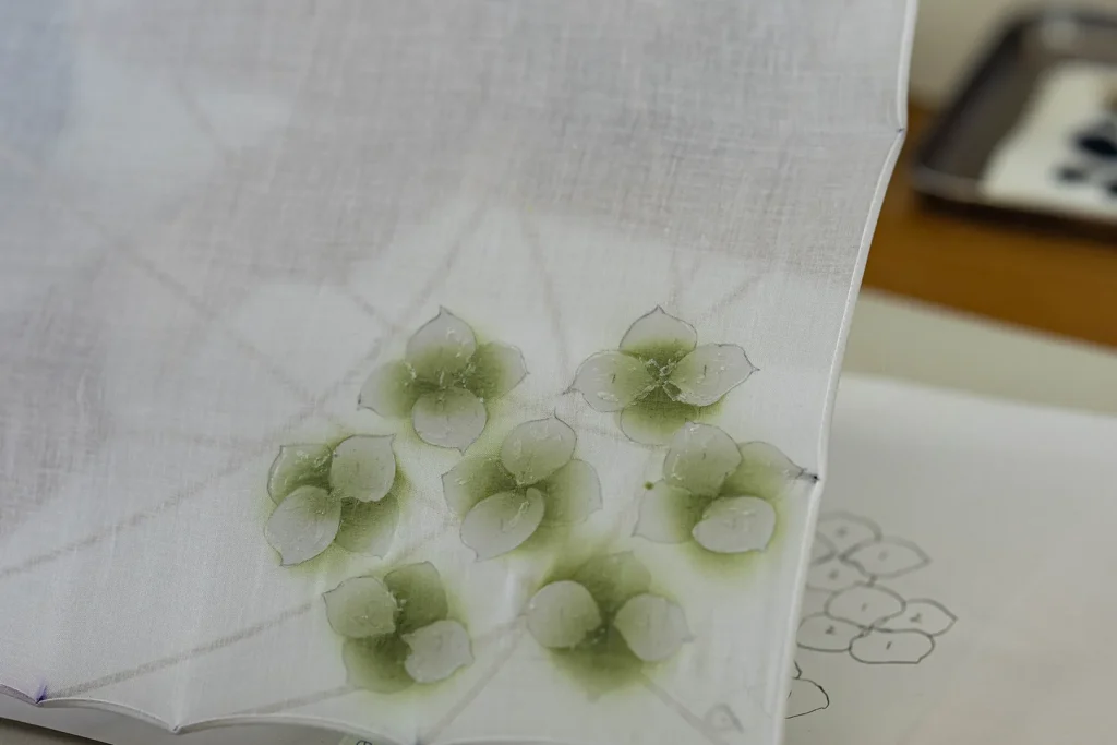 先生にご用意いただいた下書きをハンカチにトレースできましたらまず花びらを染めていきます。