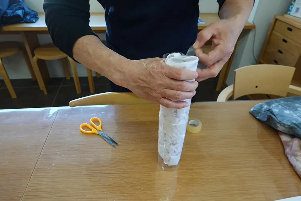 二つの夢つつシートを繋ぎ、濡らした男性用の綿シャツを中に入れて絞りました。
