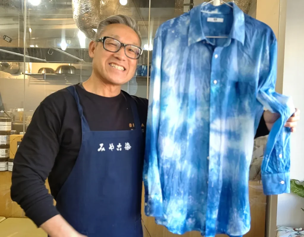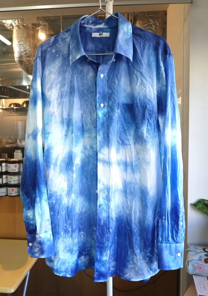 フラの男性用衣装で綿のシャツを、持ち込み染め方教室で染めました。