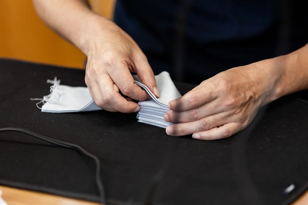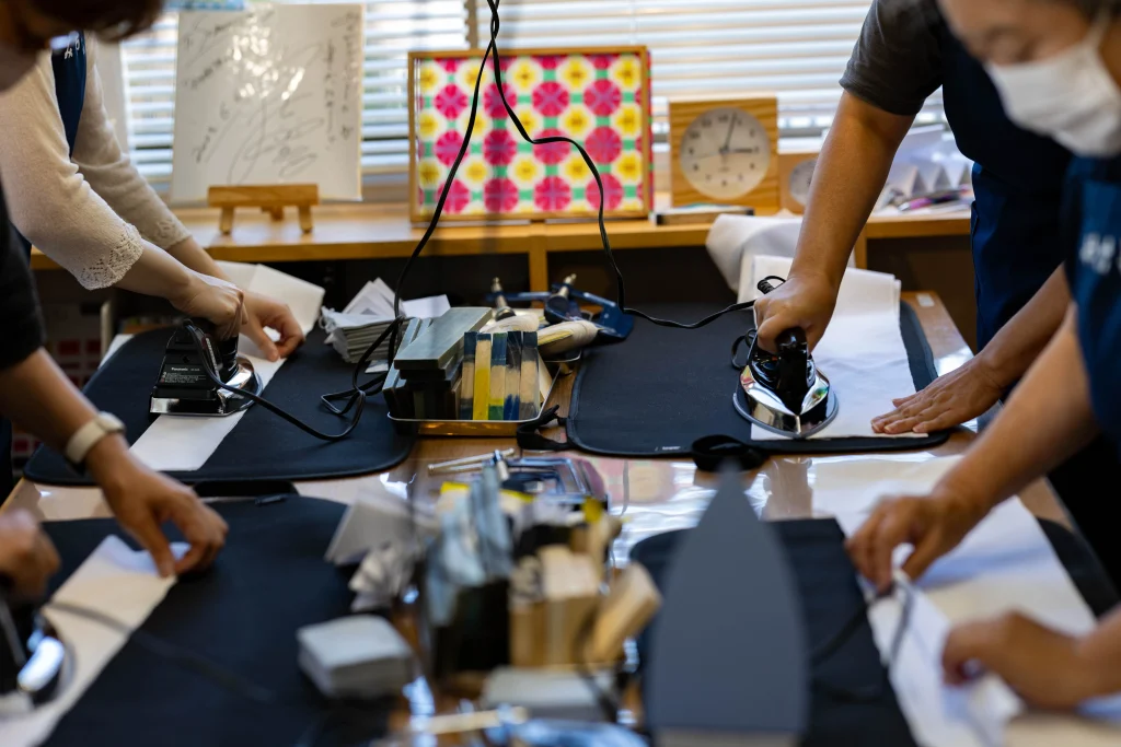 まず幅広の面を蛇腹折りで4つに畳み、横に折ります(2枚の手拭いのうち、1枚目は三角形、2枚目は四角形 に折っていきます)。紙で練習をしてからの作業ですが、布は紙のようにはいかず、それでもアイロンを使いながら、角を合わせるようにして畳んでいきます。アイロンはドライアイロンの高温で行います。