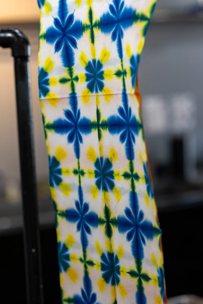 グレー地の布は、スレン染料の還元剤の性質を利用します。還元剤はスレン染料の発色を助けますが、スレン以外の染料の色を抜く性質があります。その為、グレー地の布は還元剤が触れたところは色が抜け、後からスレン染料が染まっていきます。この技法は着抜(色を抜きながら染める)と呼ばれ、複雑に作用した色が発色します。今回の安達先生の作例(下記)ですと、グレーの抜けたところに橙色のスレンが入り、橙色から分離した黄色が周辺部に美しく発色しています。