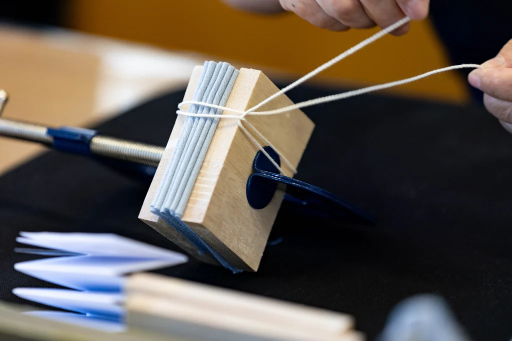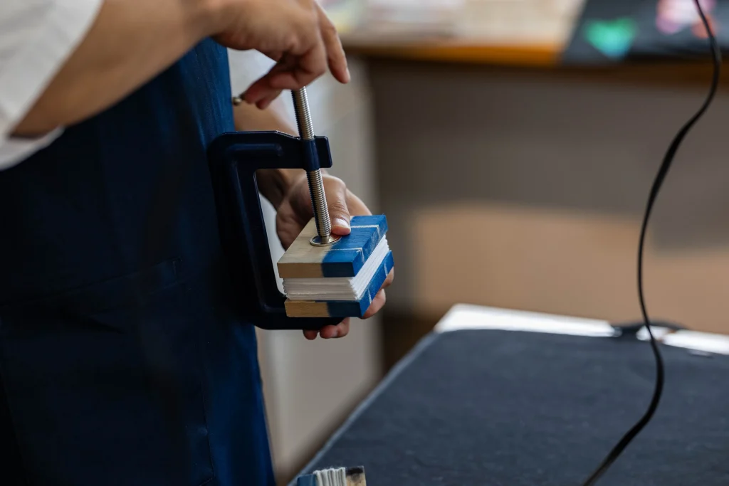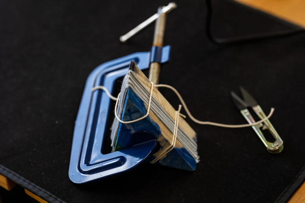 折った形に合う三角形、四角形の板を布の両側からあて、クランプで固定します。そのまま凧糸で2周程度ぐるぐる巻いて縛ってからクランプを外します。