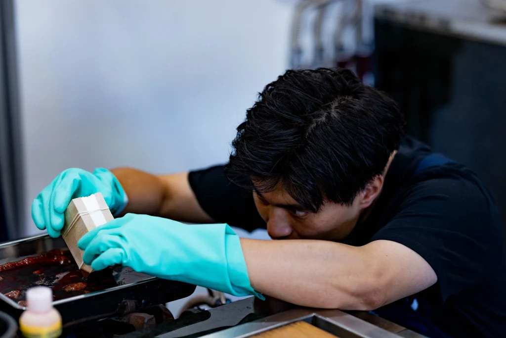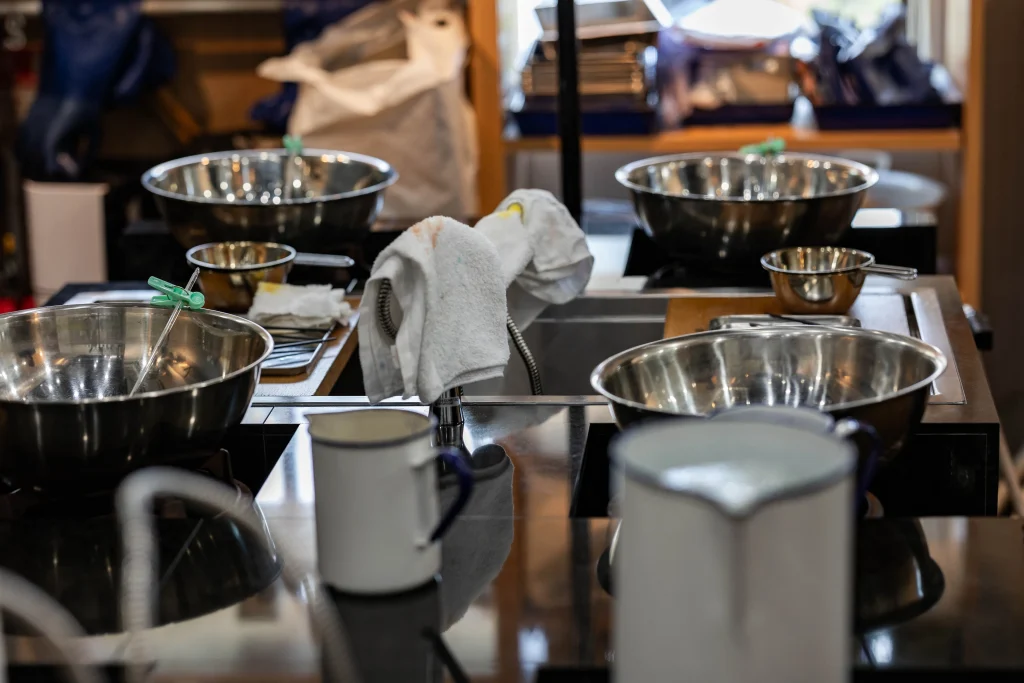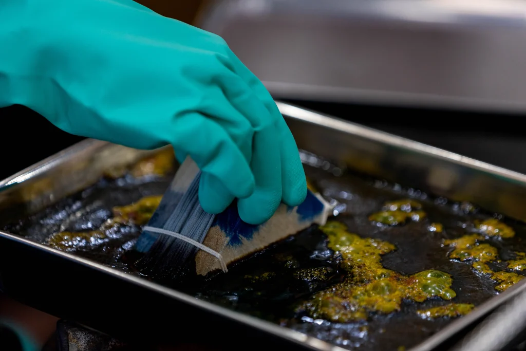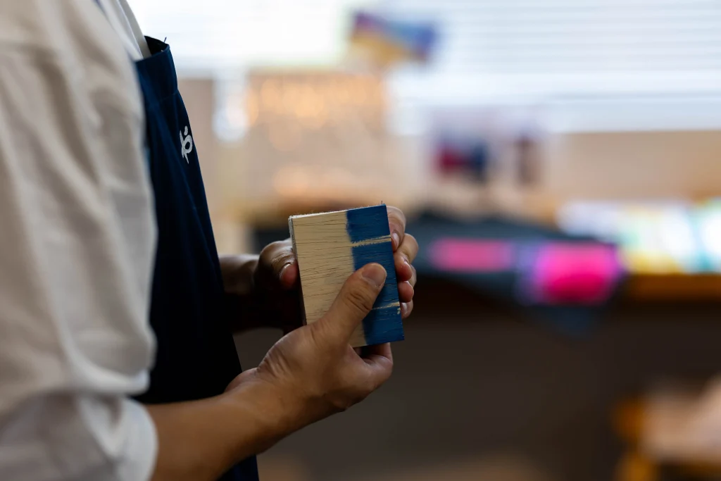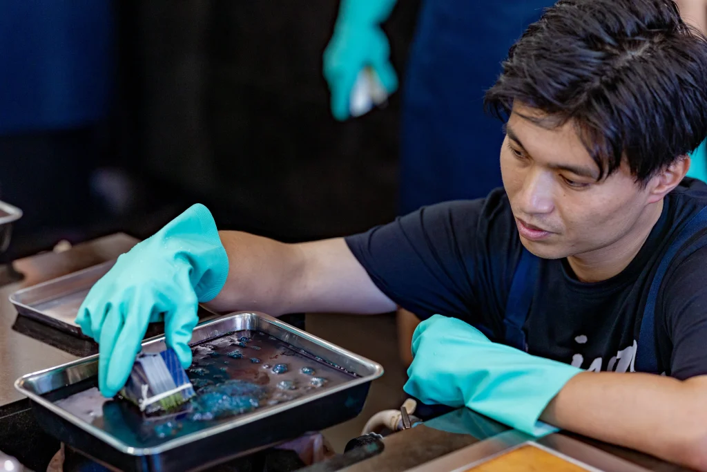 今回は、みやこ染堅牢スレン建染め染料15色から、安達氏の選んだ4色を使います。青、黄、黒、橙(赤3:黄7の割合で混合したものです)。どのように組み合わせても失敗がないであろう4色というのが氏の色の選定理由です。