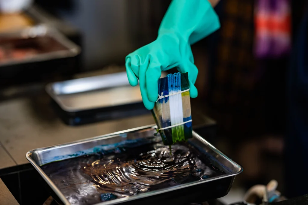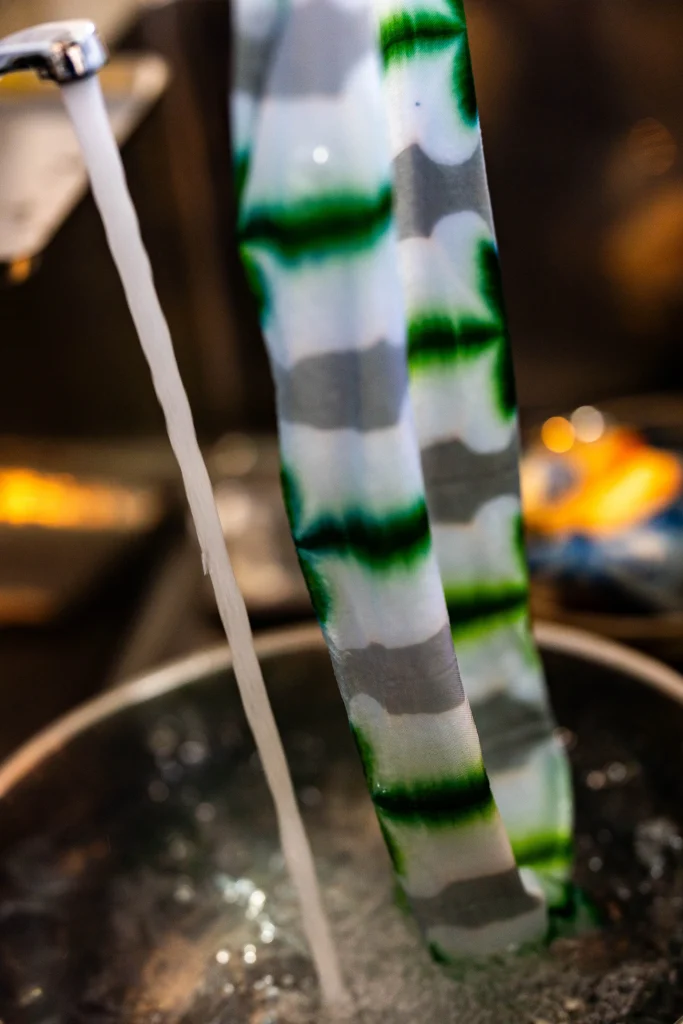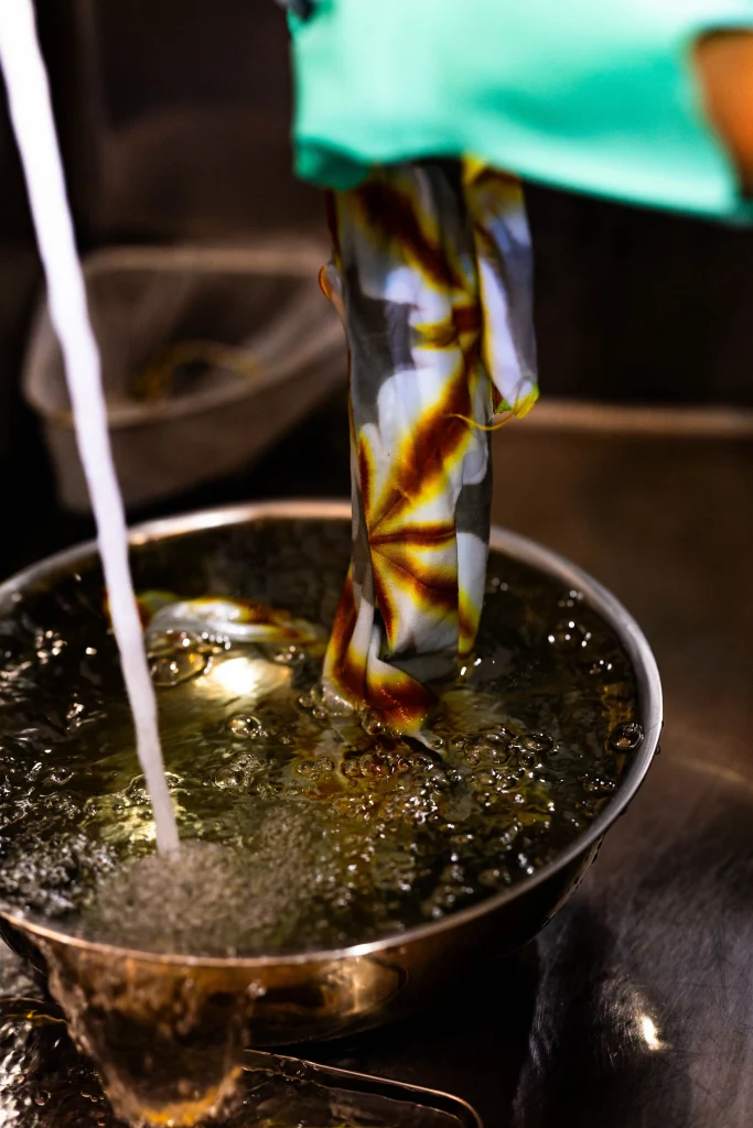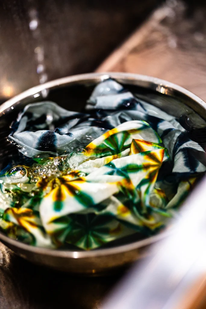 30分程度、流水に浸して濯ぐことで水中の酸素により酸化発色し、色が変化し、染料が布にしっかり染め着きます。この過程の美しい色の変化はスレン染料の醍醐味の一つです。