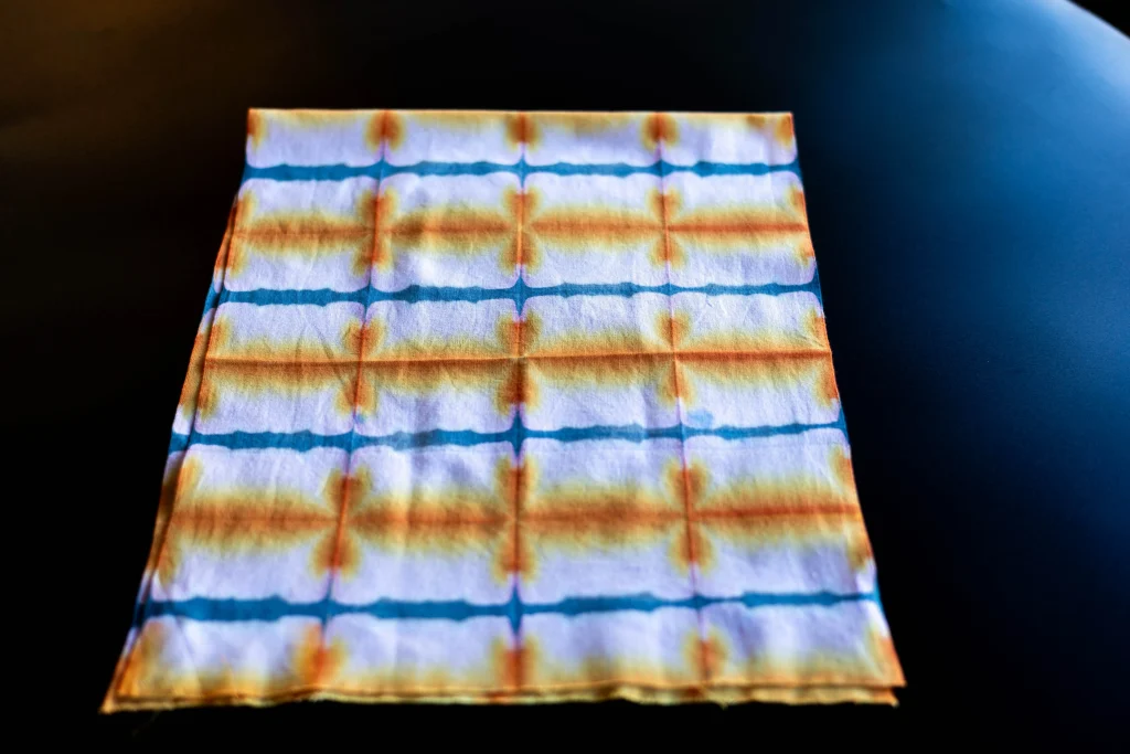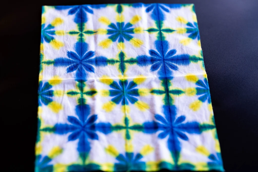 今回安達先生の作例(下記)では、2色染めは、三角形に挟んだ布の角にまず一色(青色)浸し、その後同じ角により深い位置まで、より長い時間、2色目を浸すという手法でした。このようにすることで、先に染めた角の先端部分には色が入らず(先に染めたところには2色目は色が入りづらく1色目が残ります)、2色目(黄色)が深い位置(広げた際には周辺部)に入ります。2色が混色した際の部分は青と黄が混色し3色目の緑色に発色しています。この際の出方は参加者の方の布の折り方、畳み方で微妙に異なり、一つとして同じものは出来ません。