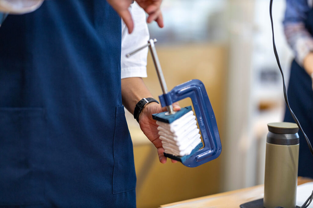 しっかりと挟むことで染料が中まで入りにくくなり、綺麗な模様ができあがります。