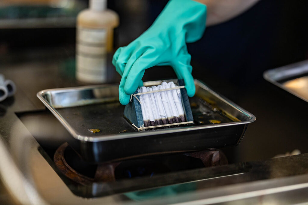 堅牢スレン建染め染料を使用し、安達先生の独自の配合レシピを用いて染めていきます。(みやこ染の配合レシピとは異なります。)
