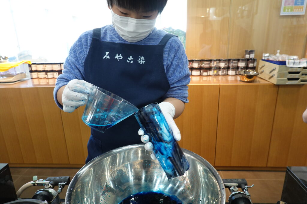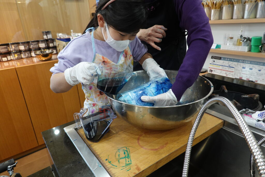 夢つつシートに入れた布に染料を注ぐだけで、ちらちらとしたむら染めが簡単にできるので、お子様も気楽に参加できますね!