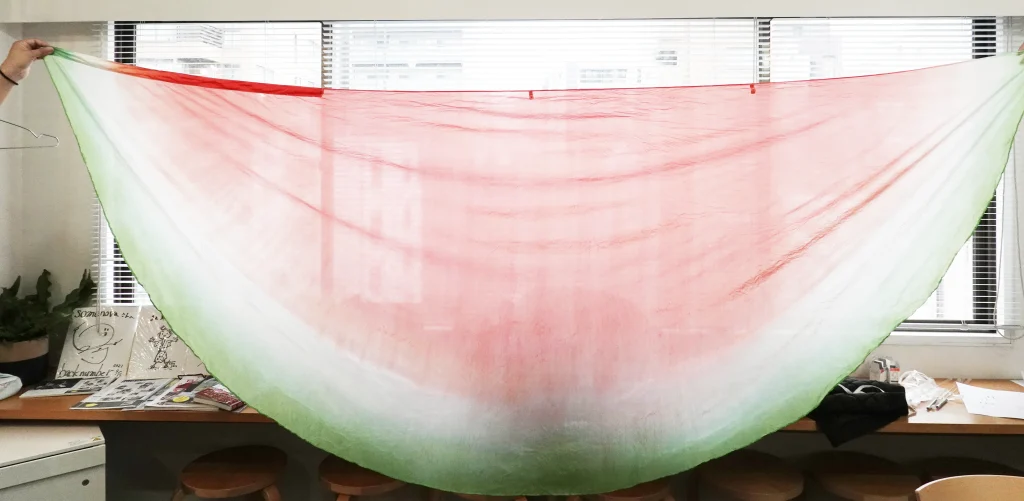 2枚の半円形の生地を同じ位置にグラデーションを染めたいので、屏風たたみにし、2枚同時に持って染めました。