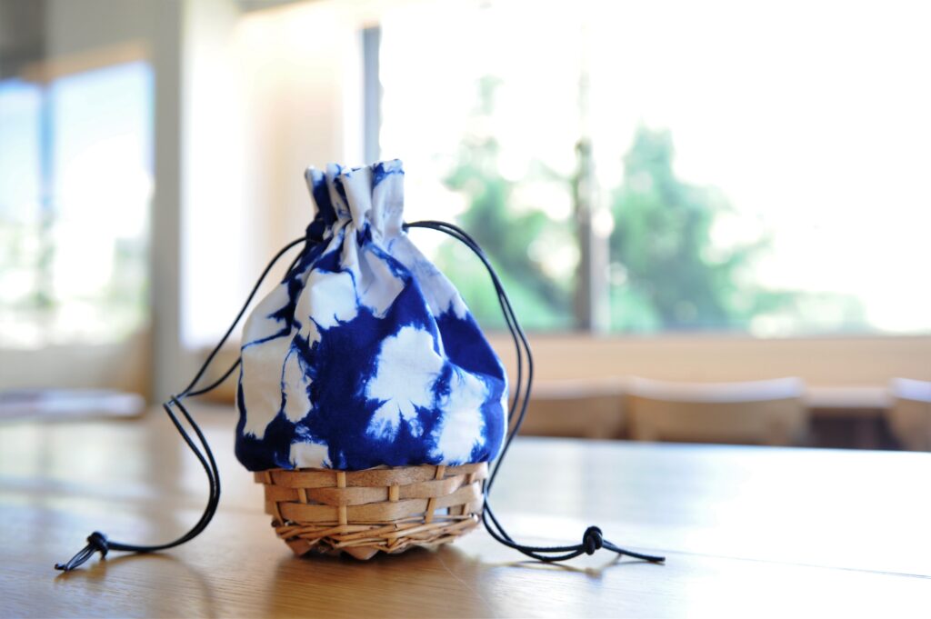 染め上げた布を巾着にして籠に縫い付ければ、世界にひとつだけのバッグの完成です。
