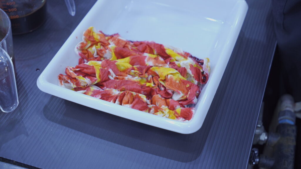 今回は技法用染料リアクトでのまだら染めとコールダイオールでの浸し染めを組み合わせた