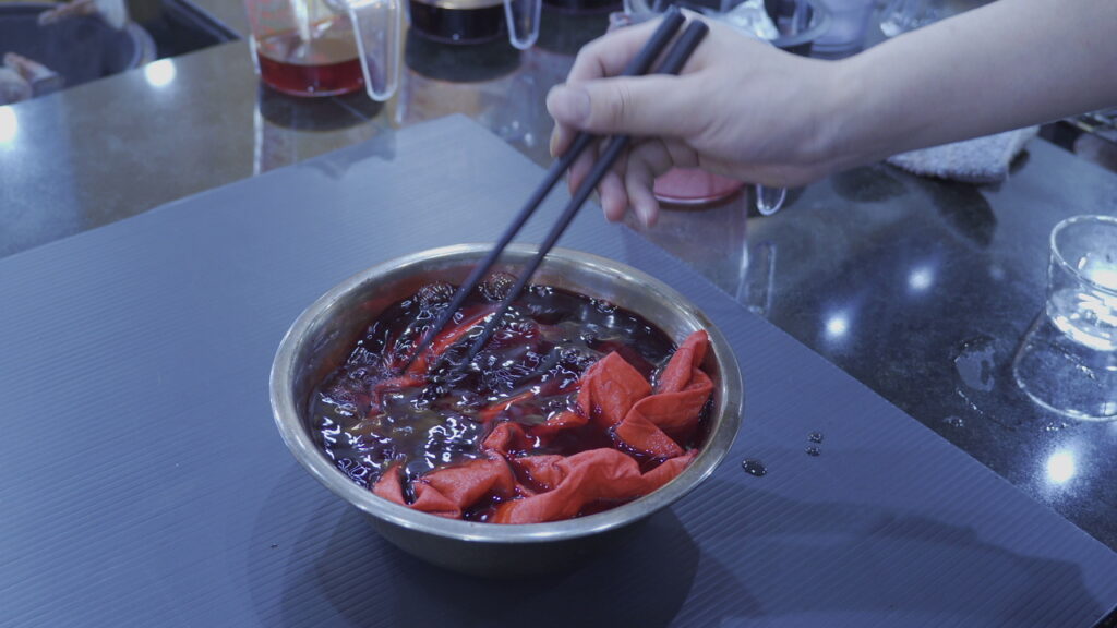 染め液から出して水で軽くすすいだ後、中性洗剤を溶いた60℃のお湯で余計な染料を落とします。
