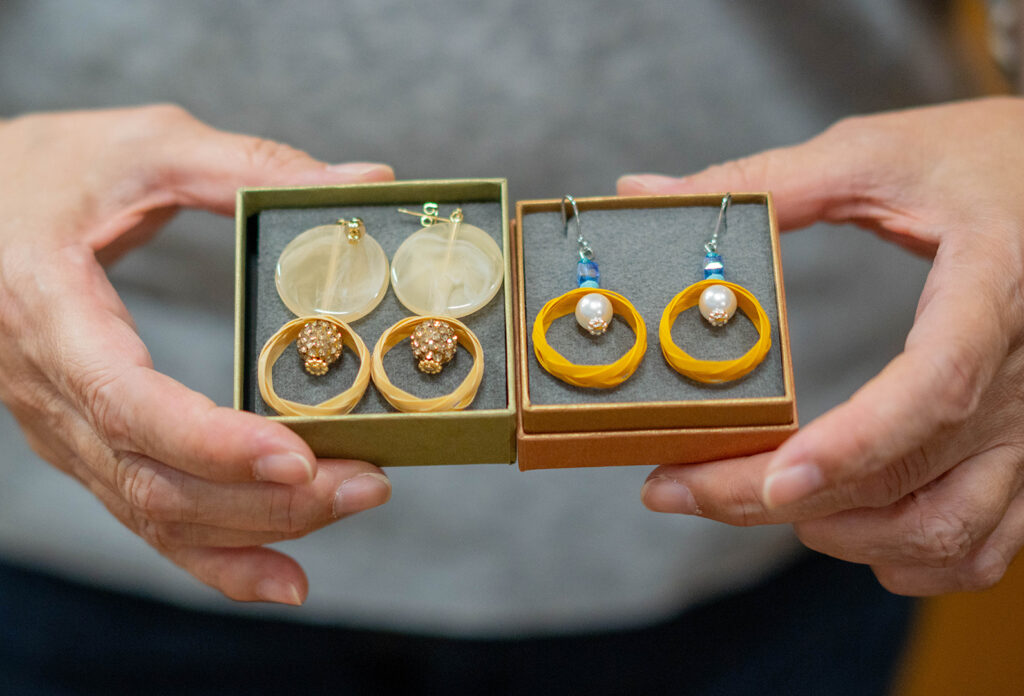 今回は1本の竹ひごを編んで、染めて、ビーズを選んでピアスまたはイヤリングを作りました。