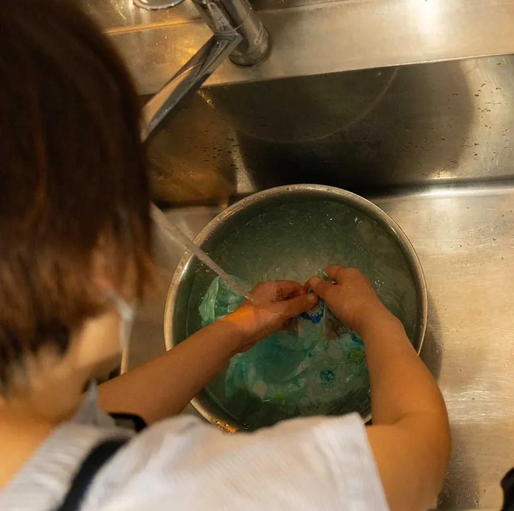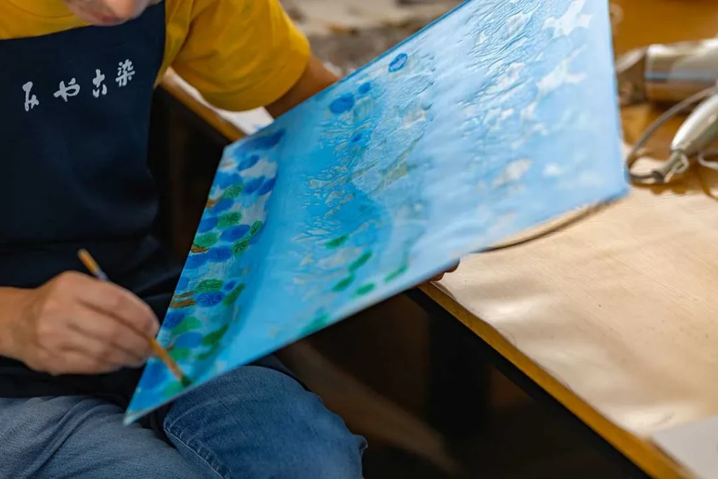竹内先生が型彫り、糊置きまでをしていただいたハンカチに、みやこ染の布用顔料「ピグティント」を使用し染色をしていきます。