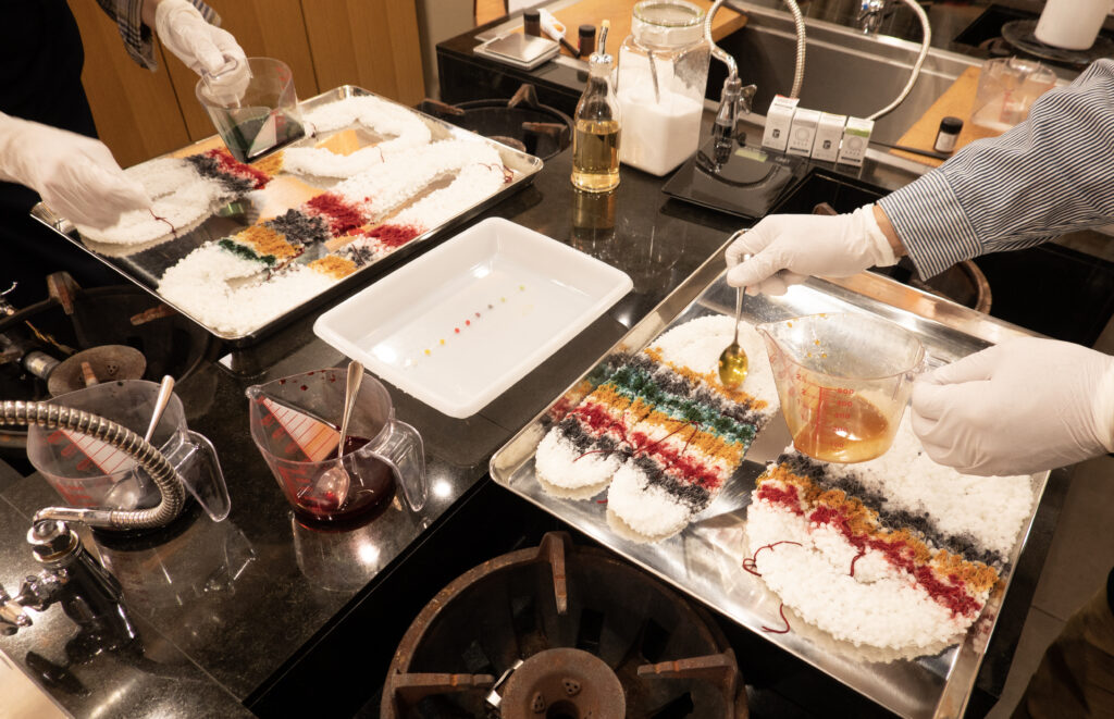オリジナルのニットのデザインを作るため、持ち込み染め方教室にいらっしゃったご夫婦のお客様。