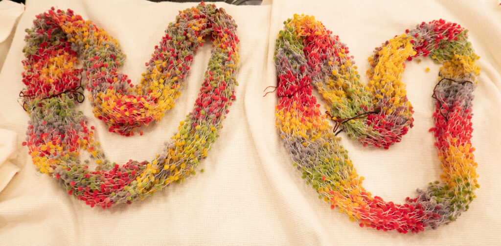 今回はナイロン素材のポンポンがついた糸を染めました。