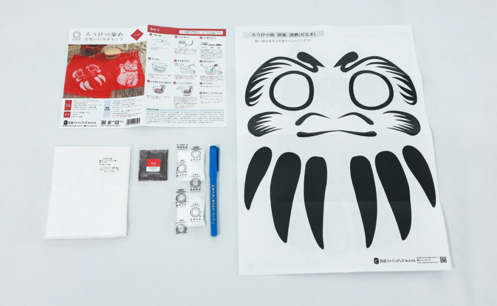 初心者の方でも描きやすいよう、絵柄の大きさや線の太さに配慮し、特に面の部分を大きく取って、”ろうけつ染め”ならではの“ろうのひび割れ”を楽しめ、その繊細さと美しさを表現できるようにしました。また、染める図案は縁起物の「達磨」と「招福猫」の2種類をご用意。どちらかを選んで制作していただけます。