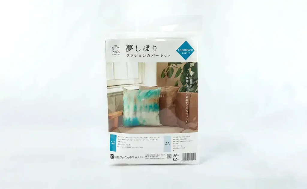 「夢しぼり クッションカバーキット」は、日本の伝統染色である”村雲絞り”(布を押し縮めて色の濃淡のむら模様を染め上げる技法)にヒントを得て、当社で独自に考案した”夢しぼり”技法を使い、染色未経験者でも失敗の無いお洒落な絞り模様を仕上げることが出来るキット商品です。