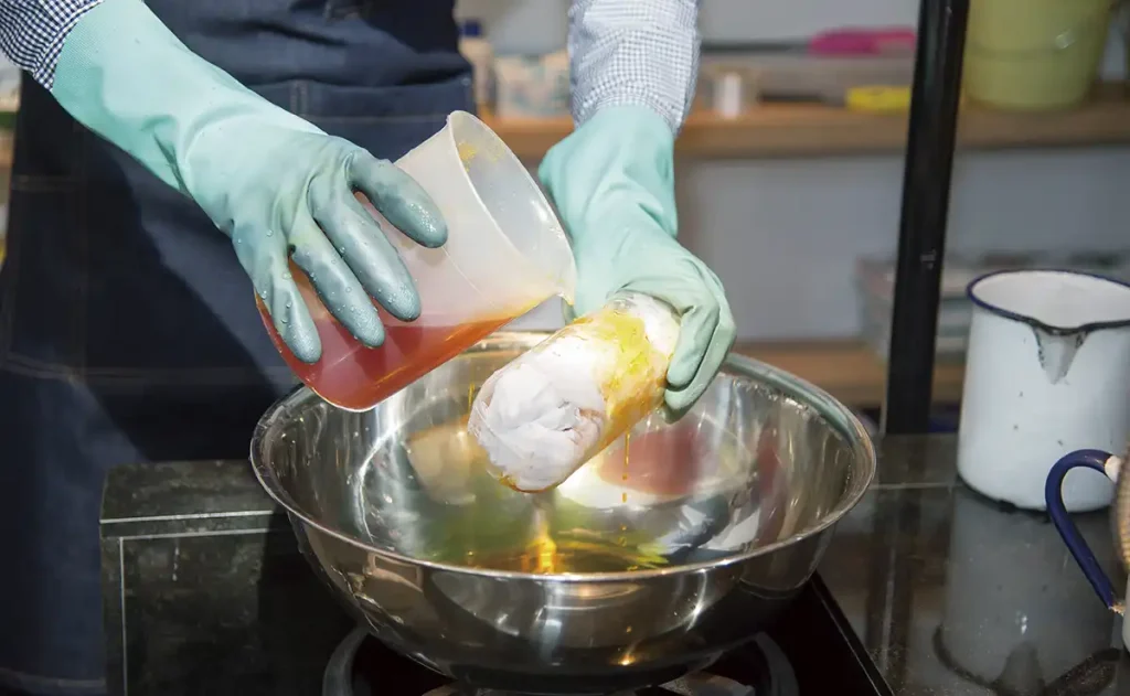 3. 容器に染料、定着剤を40~60℃のお湯で溶かし、染め液を各色作ります。