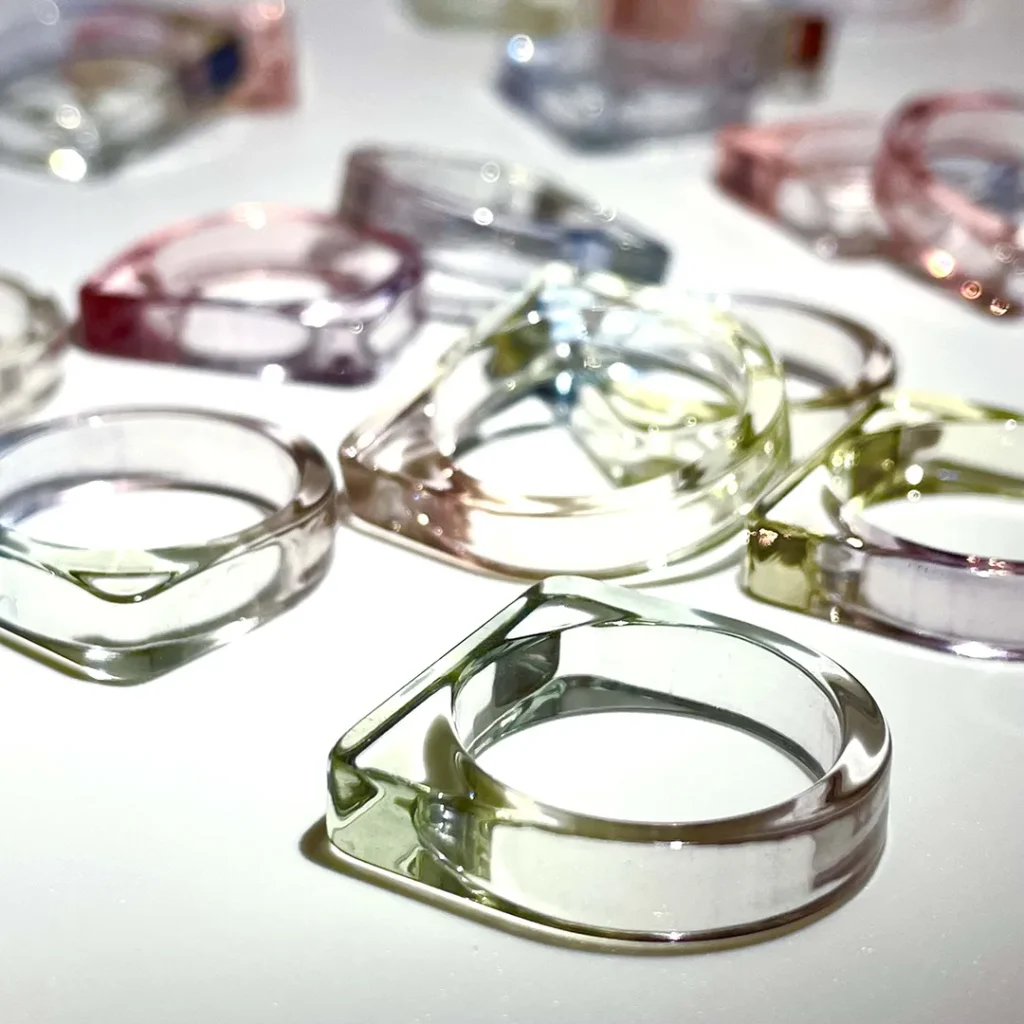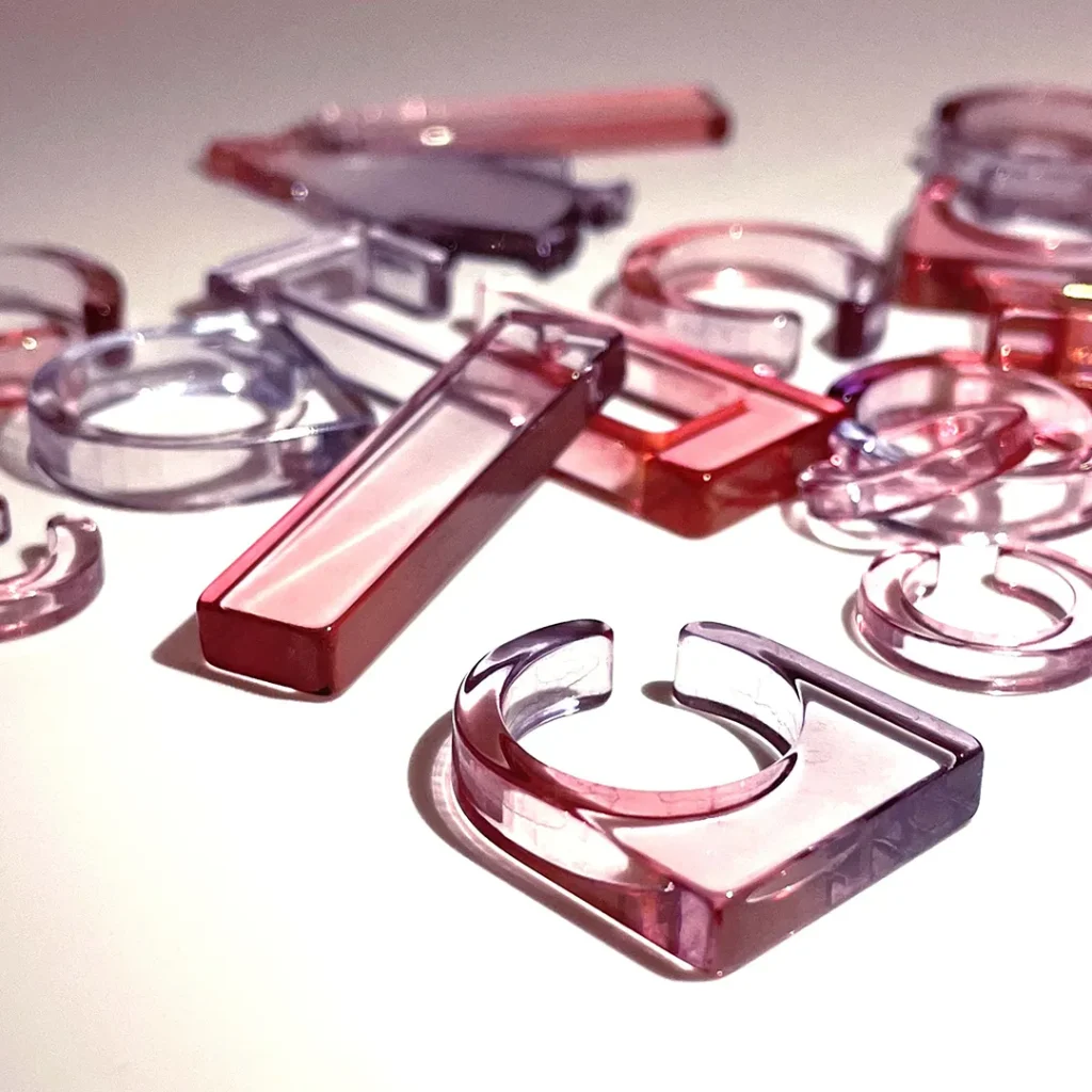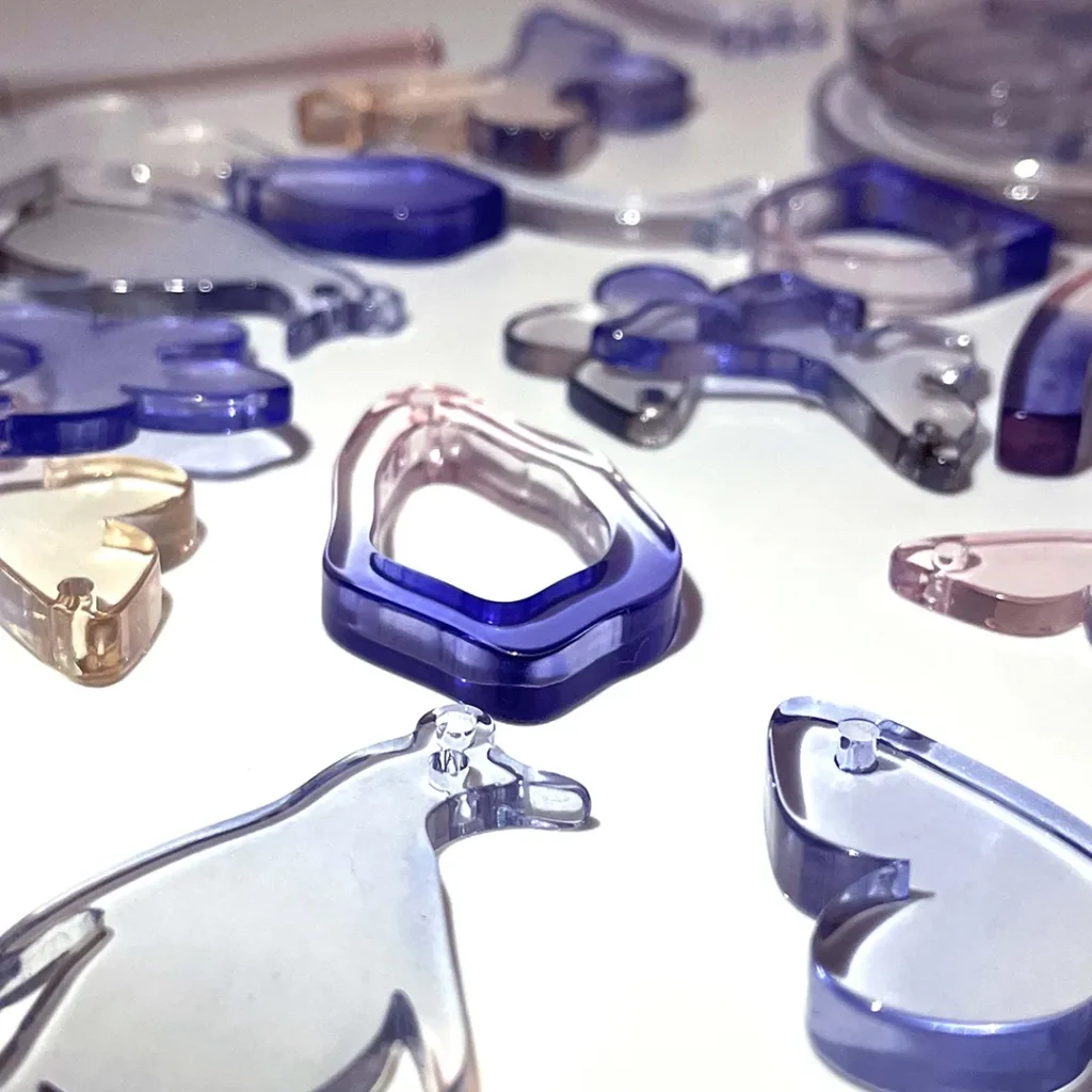色とりどりに染まったパーツは、アクリルの透明感と染色ならではのグラデーションが生かされ、とても素敵です。