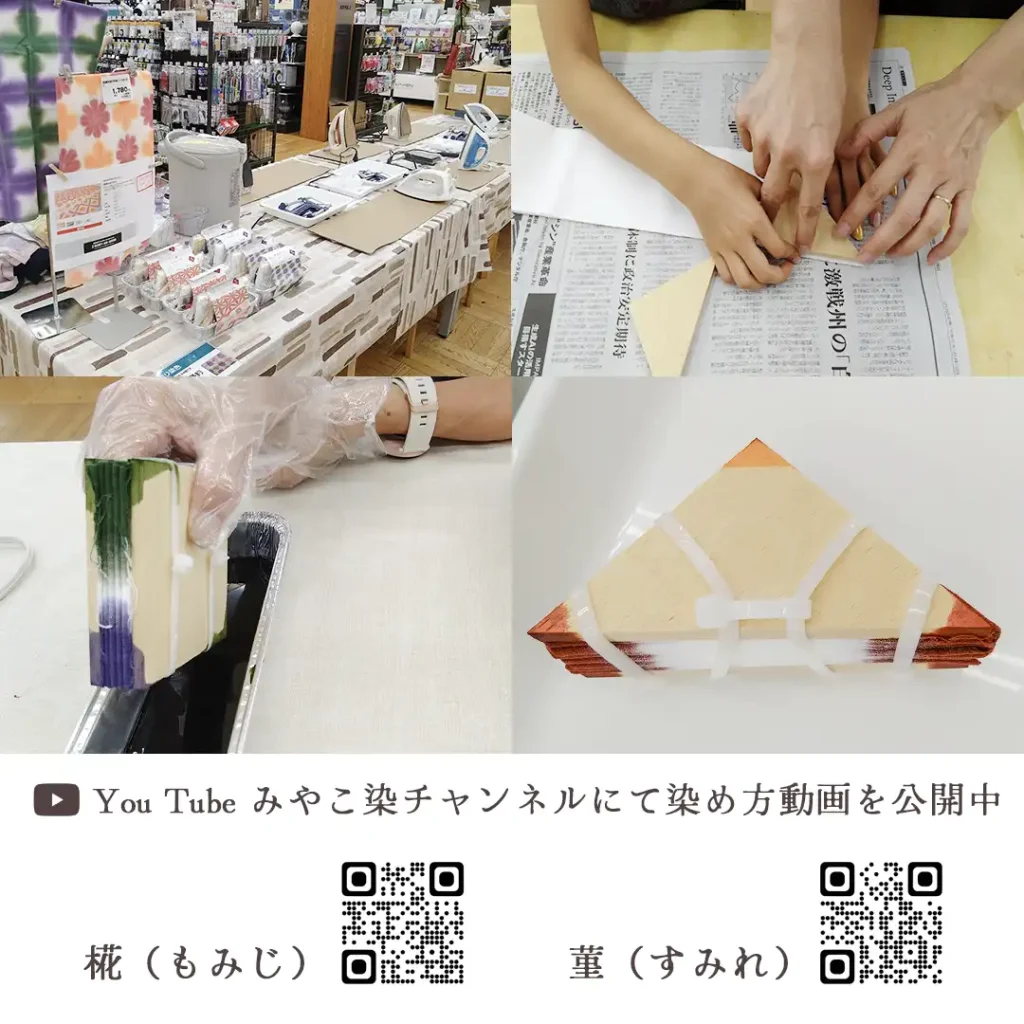 2024年8月3日・10日・18日にジョイフル本田の3店舗で板締め絞りの手ぬぐい染めワークショップを行いました。